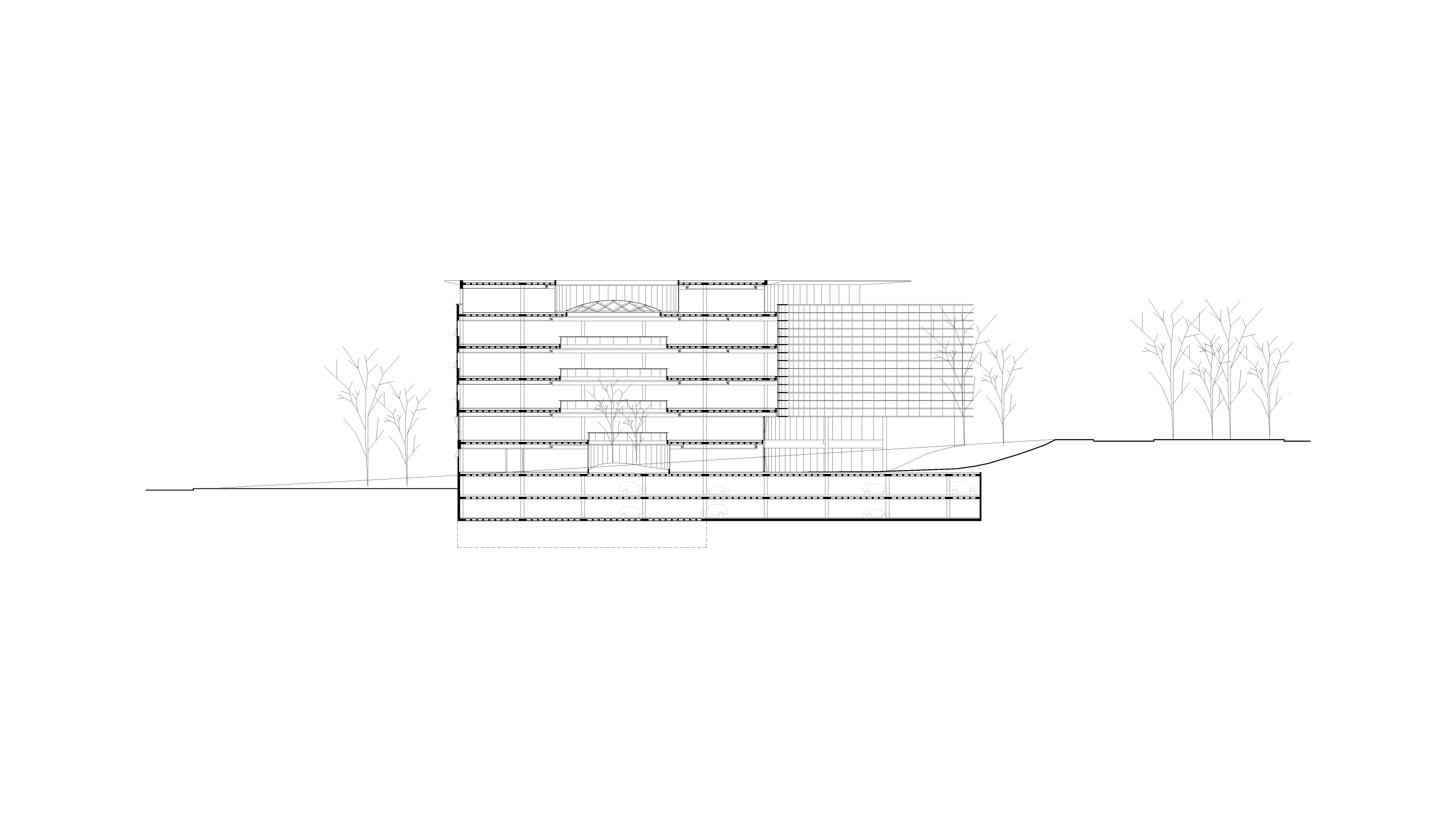 El volumen ocupa el centro de manzana reposando sobre un zócalo que resuelve espacialmente la pendiente del sitio y alberga las funciones anexas con sus diferentes accesos, como así también, la futura ampliación del edificio.