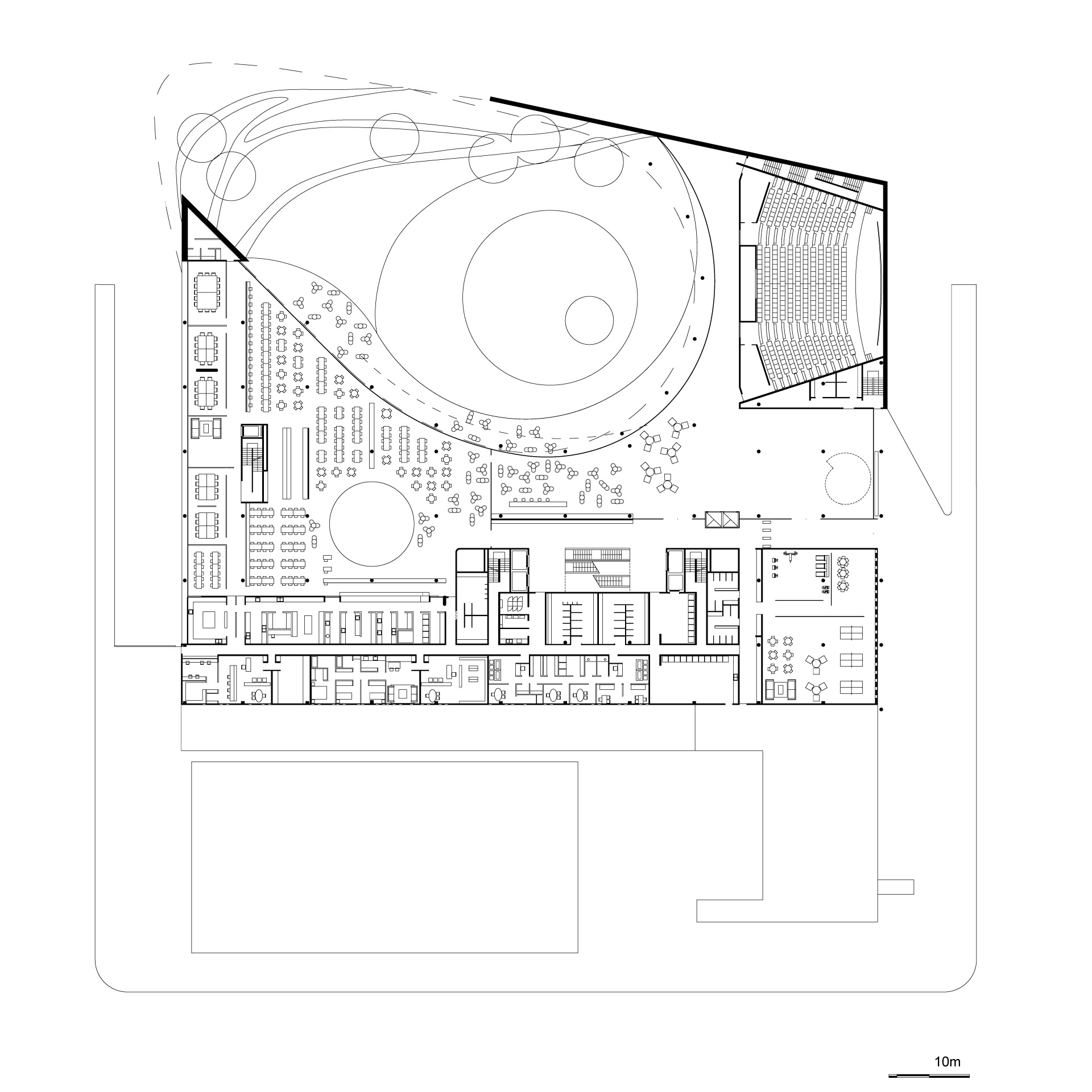 Además de la mencionada zona de oficinas abiertas que aloja la mayoría de los puestos de trabajo con vistas al parque, la planta tipo propone, a lo largo de sus tres fachadas rectas, sectores, ideales para oficinas privadas, oficinas de grupo o salas de reuniones.