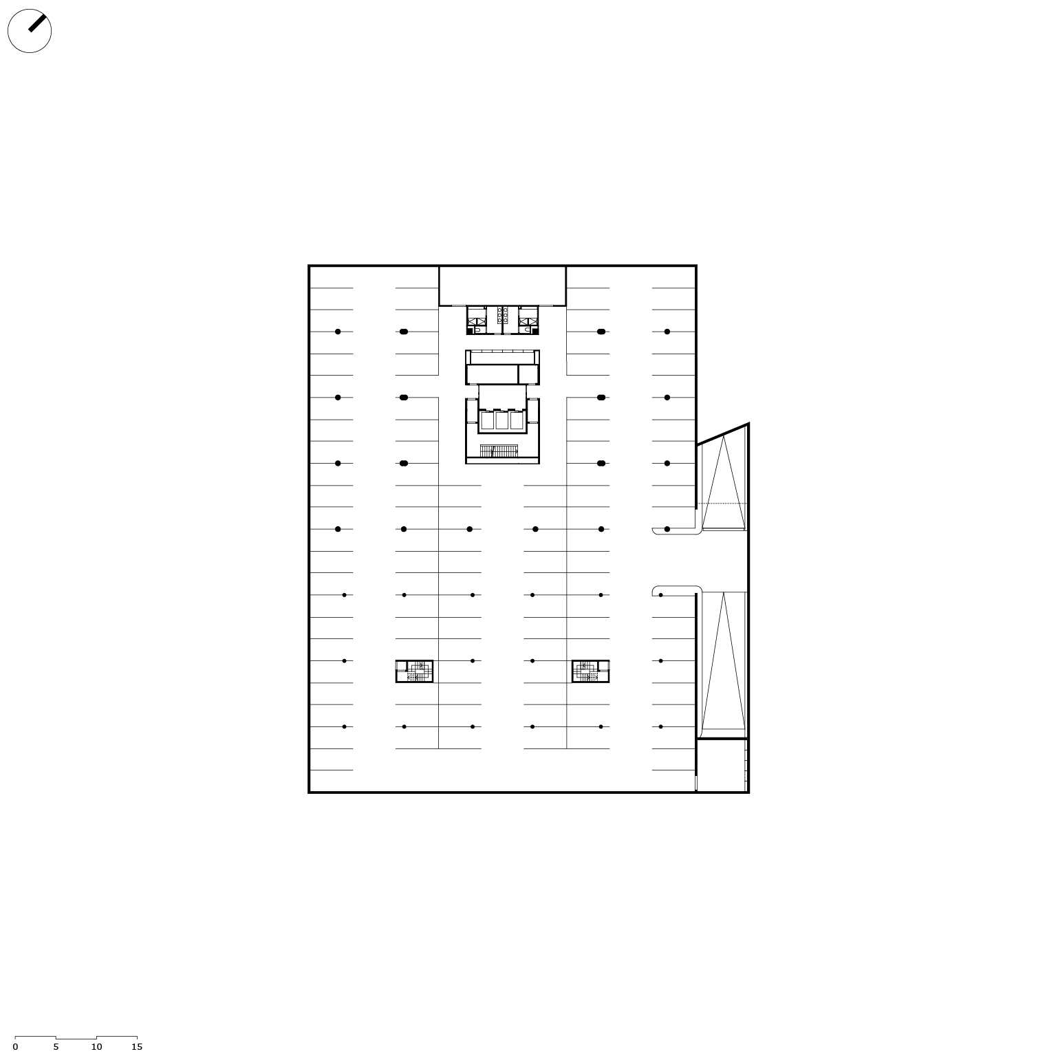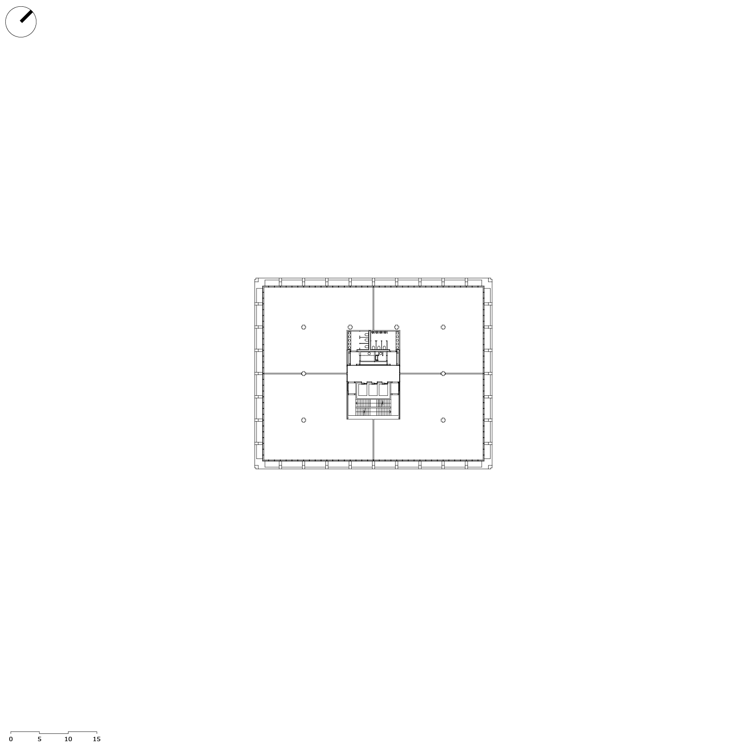 La fusión de estructura, fachada y protección solar optimiza recursos y libera un espacio regular para un programa administrativo, de flexibilidad corporativa y/o múltiple, que permite explorar un principio que admite crecimiento y cambios dentro de una misma envolvente. Las plantas se organizan en cada nivel como espacios libres complementados por un núcleo central, divisibles según la disposición de las seis columnas interiores, conformando una trama integral de espacios de trabajo flexibles.