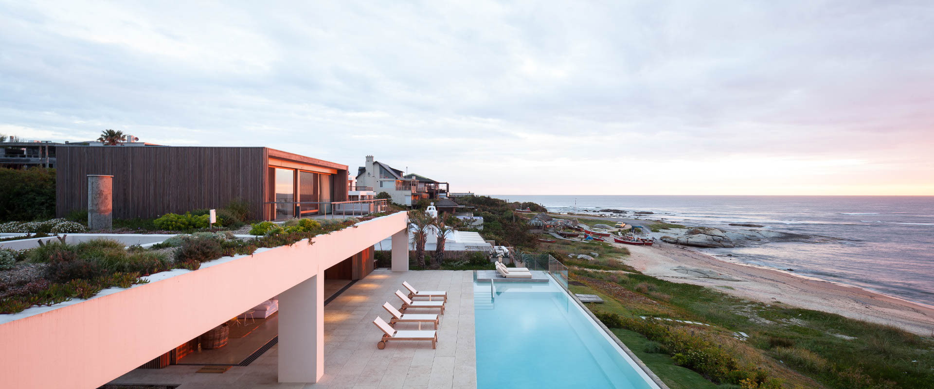 La casa original, un bloque compacto de dos plantas dispuesto en la barranca frente al mar, fue construida en los años 90 cuando la localidad uruguaya de José Ignacio, al este de Punta del Este, mutaba de pueblo de pescadores a balneario exclusivo de 25 manzanas. La intervención actual expande y abre la casa hacia ese entorno natural privilegiado, extendiendo especialmente el nivel de la planta baja en un gran semicubierto complementado por un nuevo pabellón, con excepcionales vistas al atardecer sobre el puerto de pescadores.