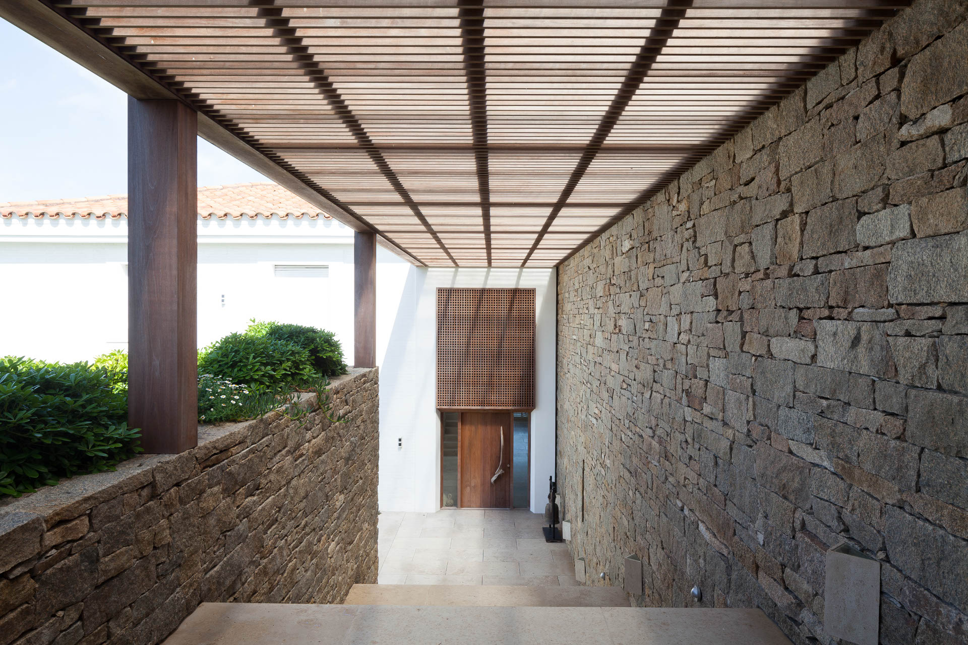La construcción existente de muros de ladrillo con techos de teja colonial conformaba un volumen tectónico tradicional, circundado por algunas galerías perimetrales. La renovación material 25 años después, interviene esa definición muraria dominante con un ensamble de nuevas tecnologías: estructuras de hormigón, muros de piedra, pérgolas y revestimientos en madera de lapacho natural que se agrisará con el tiempo, conformando límites más abiertos y tamizados, de comportamiento variable, contenidos entre el plano del semicubierto sobre planta baja y un piso homogéneo de piedra jura que materializa la continuidad entre interior y exterior.