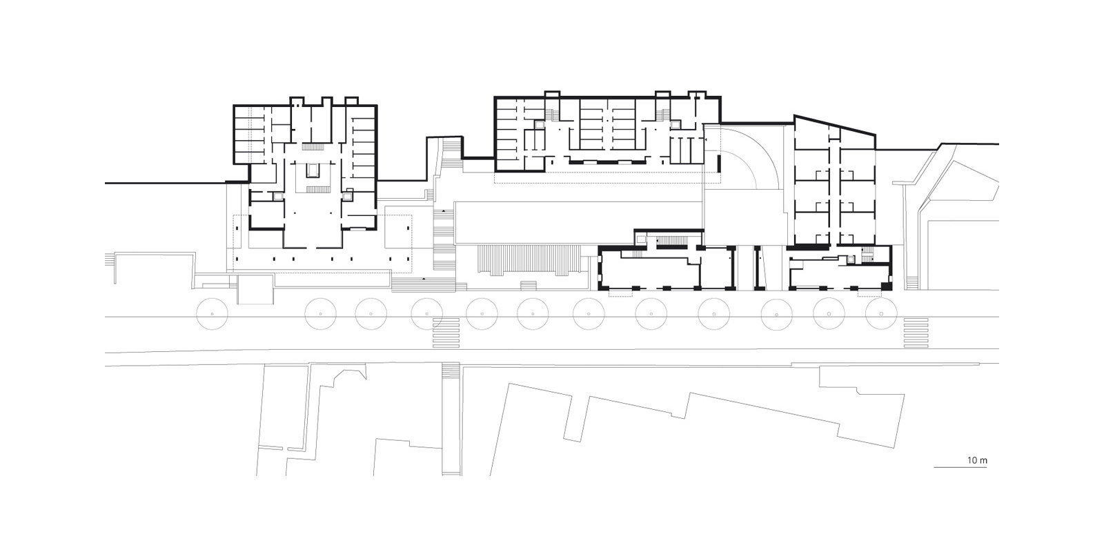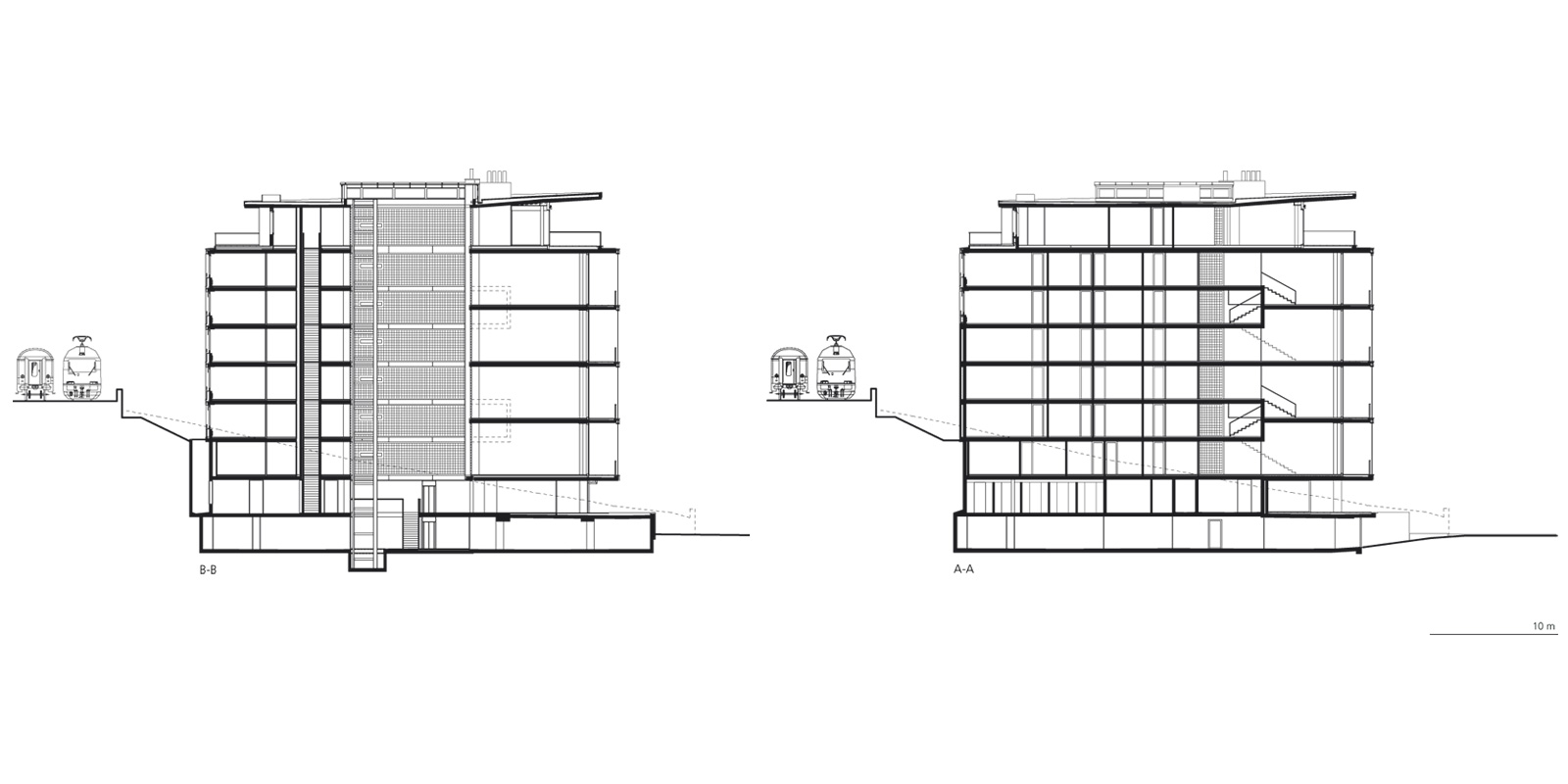 Located on the banks of Lake Geneva, the city of Montreux benefits from a particularly gentle climate giving it a Mediterranean character. It has become, since the 19th century, a popular tourism and pilgrimage destination, especially for a affluent international visitors. This city is well known for its elegant hotels and residences facing the Lake. The project called “La Verrière” consists of the renovation of a long and narrow existing building distinctive mainly for the glasshouse—an old winter garden located at its west end—that was integrated to the renovated part of the project. Inserted between this ancient masonry building, just behind the famous “Montreux Palace,” and the train tracks leading to the Montreux station, two tall residential buildings were erected, with their back leaning on the railway and their main façade completely open towards the lake.