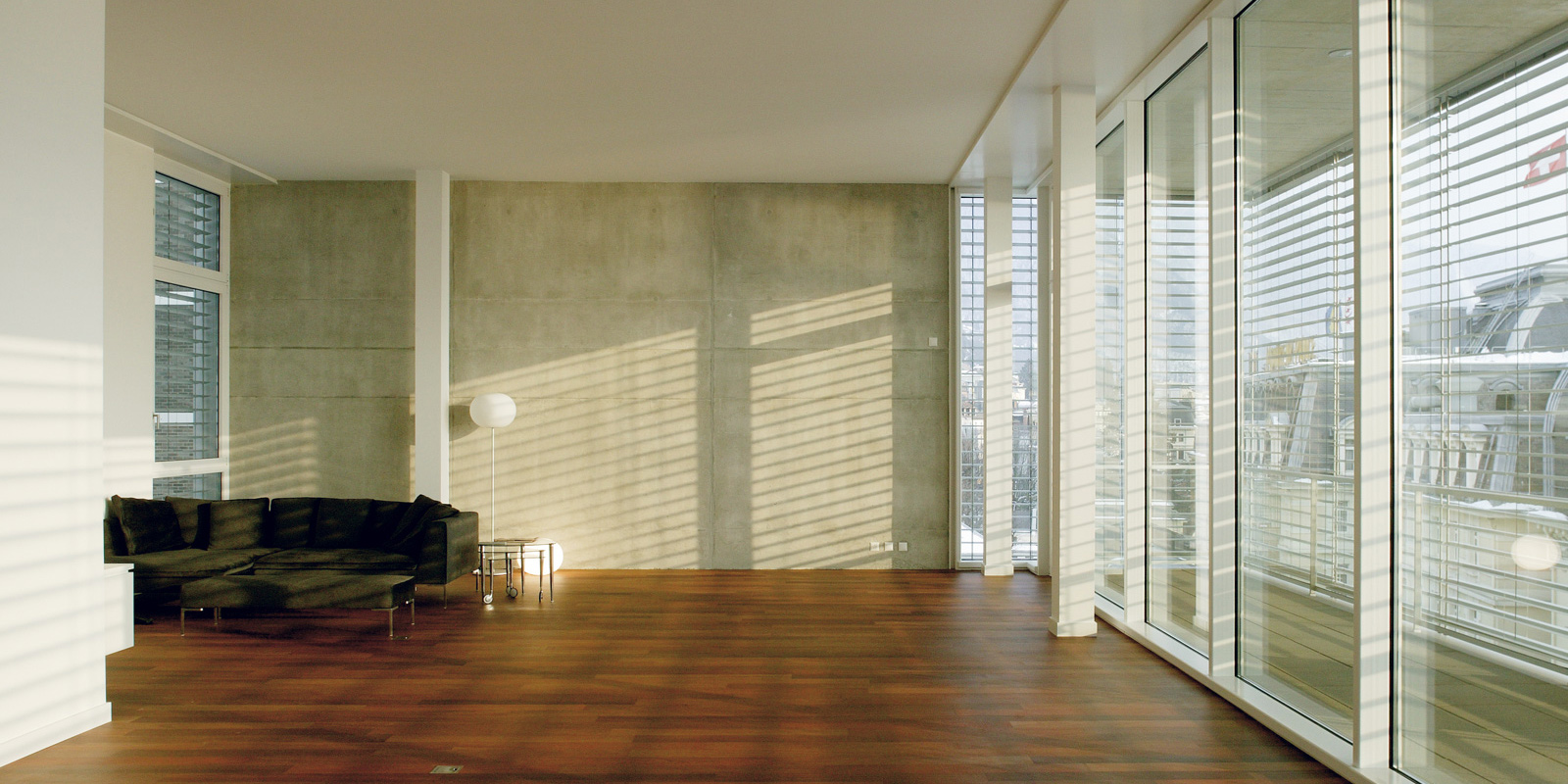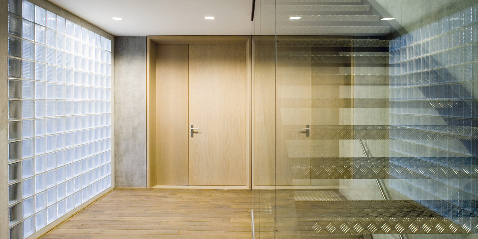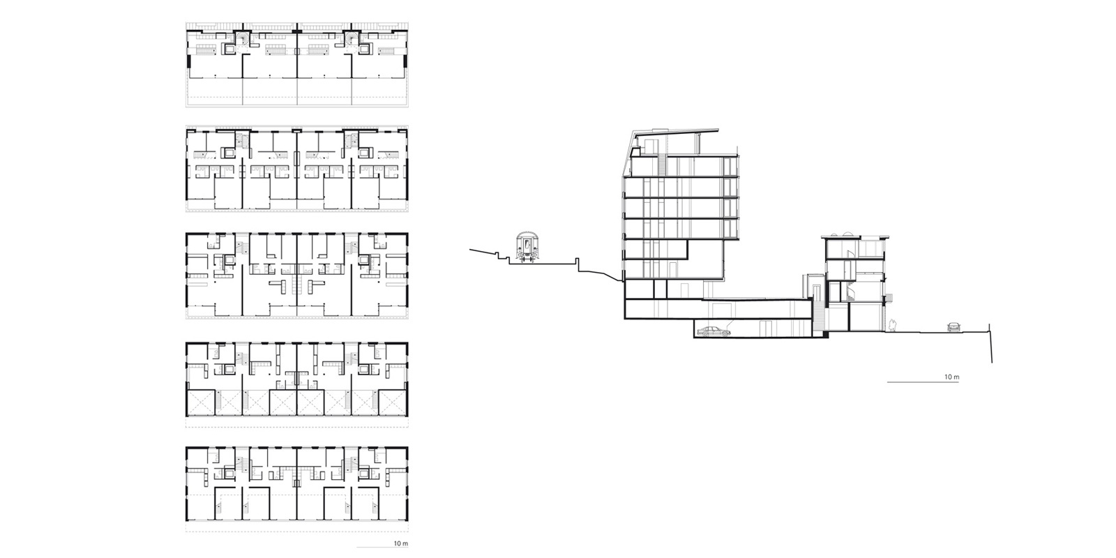 For these new constructions—two glass and brick volumes inserted into the sloping terrain and supported, at street level, by a series of concrete pilotis—the main architectural challenge was to break slightly from a traditional apartment typology of single-level dwelling units in order to provide floor heights appropriate to the proportions of living spaces. To do so, each apartment is composed of two different levels. Facing the lake, are living rooms with dramatic ceiling heights, while rooms surrounding the interior courtyard – bedrooms, baths kitchens, and dining rooms – have average ceiling hieghts. A series of two different typologies perceptible mainly through the project’s section thus overlap, both vertically and horizontally. In order to rationalize construction and articulate the “L” shape plan of each flat into a compact volume, all flats were distributed around a generous inner courtyard, the sides of which are composed of glass bricks to allow maximum income of light into the circulations and creating interesting shadows as the inhabitants move around their respective homes. The facade facing the lake, all in glass, is protected by a series of horizontal shades located at the edge of the balconies, blurring the distinction between inside and outside and conveying a sense of lightness to the whole.
