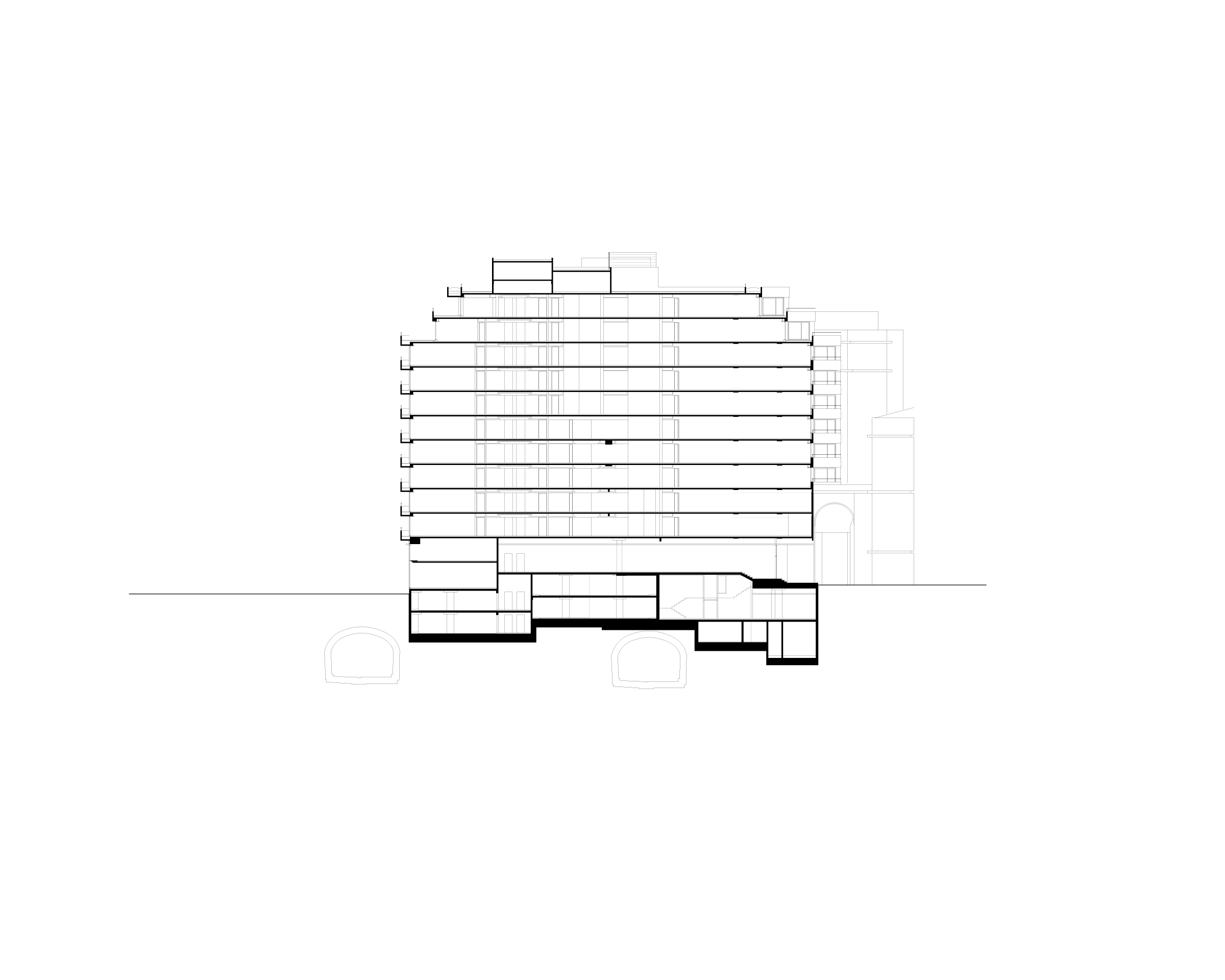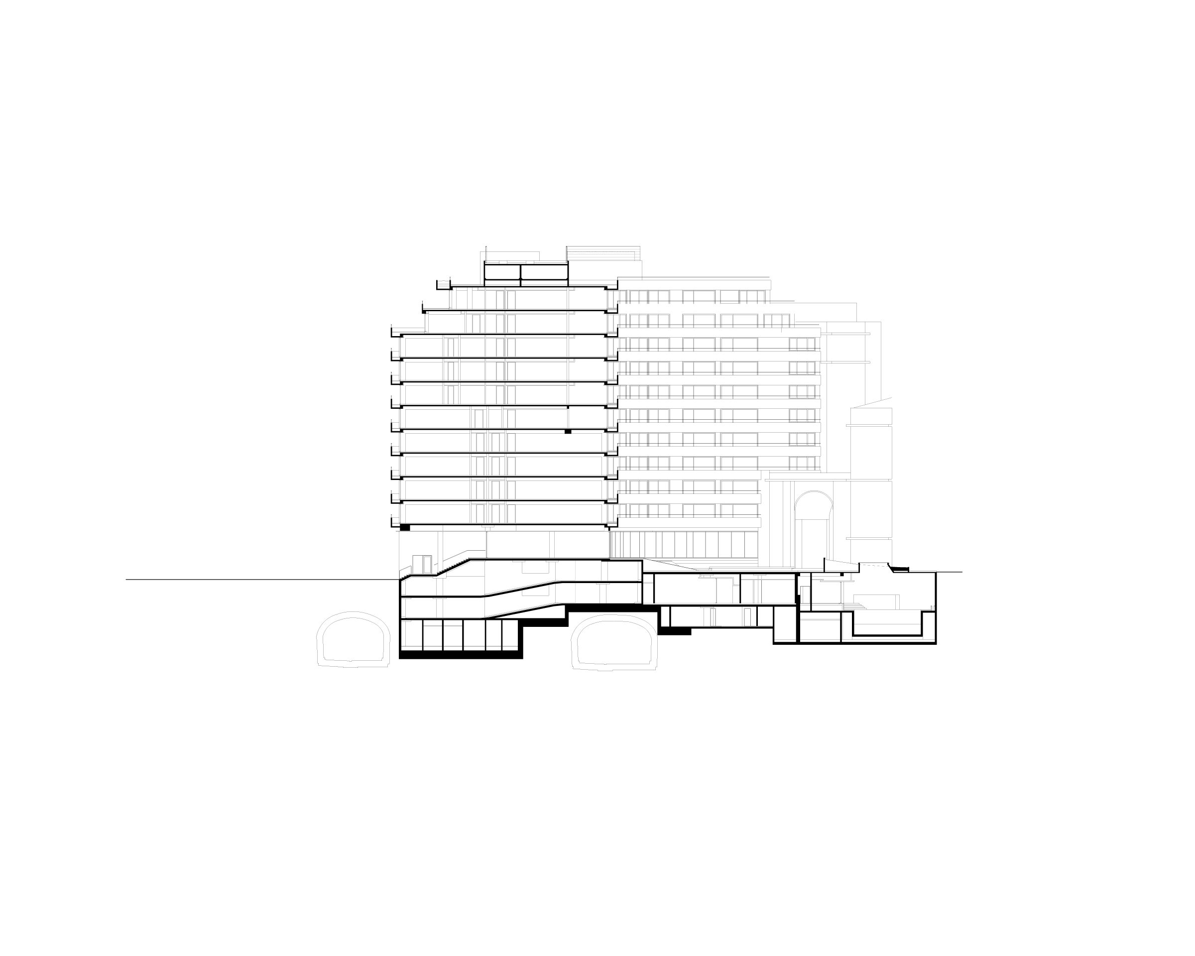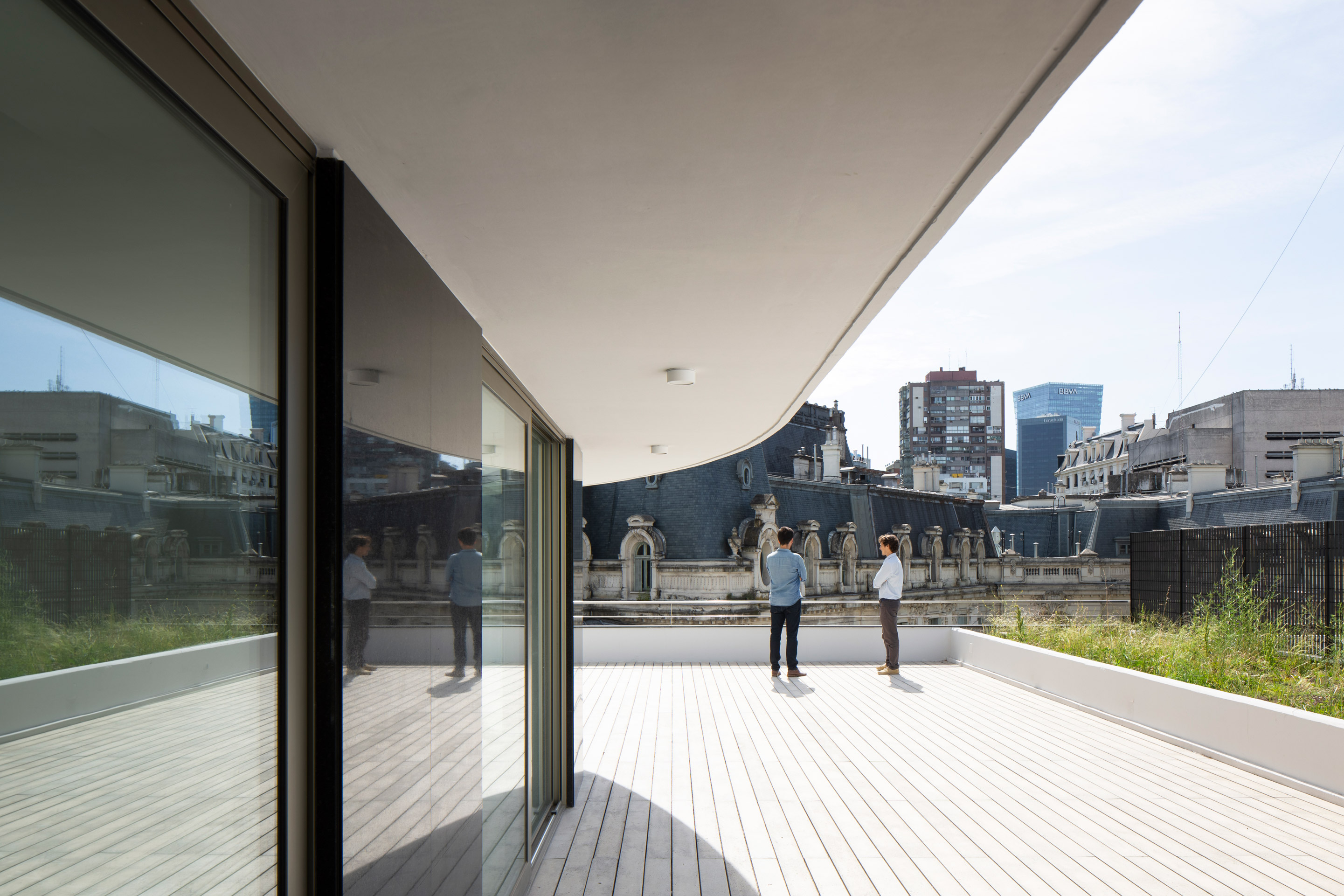 Palacio Paz XXI introduces a new mixed program with a construction that reorganizes the built volume of the block, based on a levelling operation that gives a new continuous urban facade to the set of buildings located towards Santa Fe Av., configuring a substantial improvement of the interior landscape. It replaces the sports club, which left party walls in plain view on both sides towards Esmeralda St., where its imposing blind façade collided with the narrowness of the street and did not provide activity or attractive views to public space. The new building faces the street with continuous balconies, which realignes the height of the existing buildings on both sides and models a series of horizontal bands that introduce great continuities between the different fronts of the building, opening the space to air circulation and natural light.