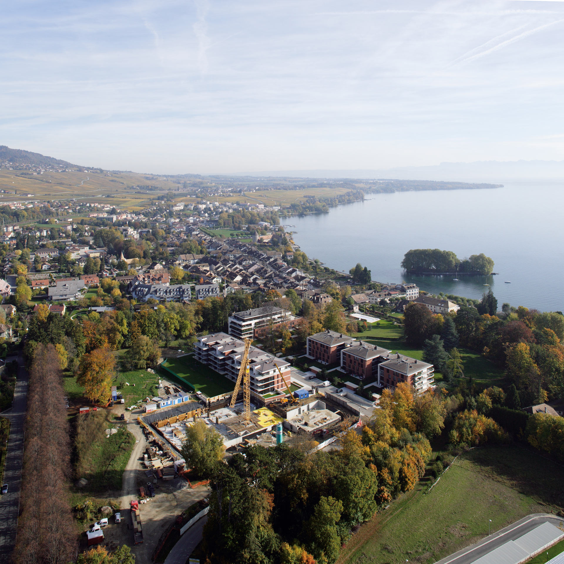 This project consists of a series of buildings, essentially a new neighbourhood, near the old centre of the small town of Rolle situated on the shores of Lake Geneva between the two major urban centres of Geneva and Lausanne. At walking distance from both the centre of the medieval town and the lake, “Les Uttins” consists of three commercial and administrative buildings and four apartment buildings. Presented here is the first apartment complex—“The Oaks.” This building houses 28 apartments with double orientation, located in a luxurious park and offering views onto the lake. The shape of the building is the result of the combination of a series of long horizontal planes forming terraces and balconies facing the park with three compact volumes containing the apartments.