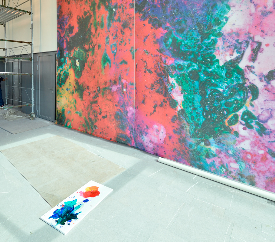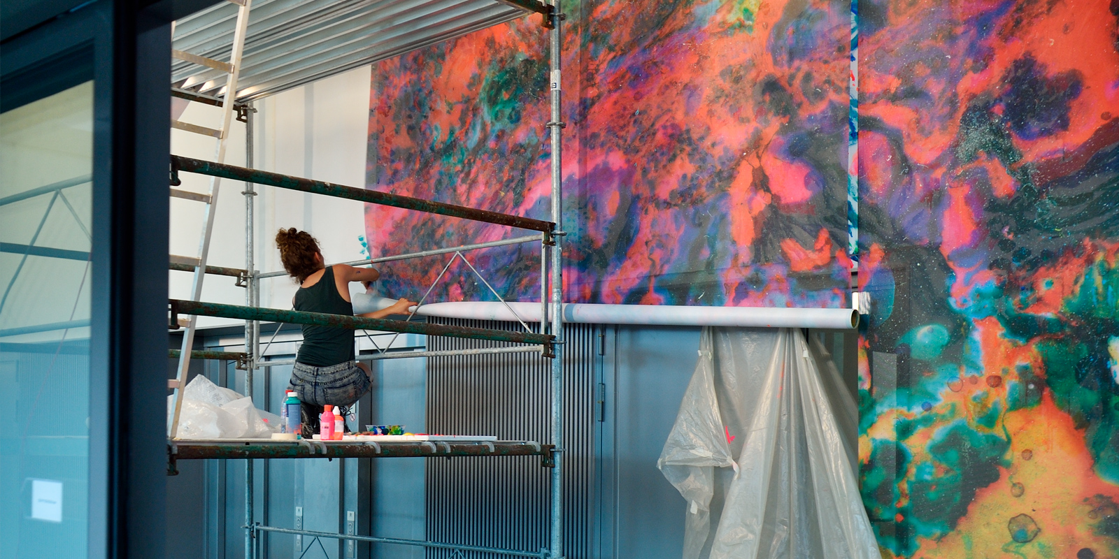 More especially at night-time, the building’s cantilever showcases the spectacular, over 100 m2 wall of the lobby. Very early on, and in agreement with the client, we imagined how we could highlight this space. At night-time, the indirect ceiling lighting gives the impression that the front part of the building is actually levitating and offers perfect visibility for hosting major artistic creations. We had the great pleasure to organize a competition with 5 young Western-Swiss artists and Maya Rochat’s works were selected and installed in the lobby and those of Anouchka Perez in the atrium. This concept could be renewed every other year and would be a way of perceiving the building in a new light whilst promoting the creativity of young artists from Western Switzerland.