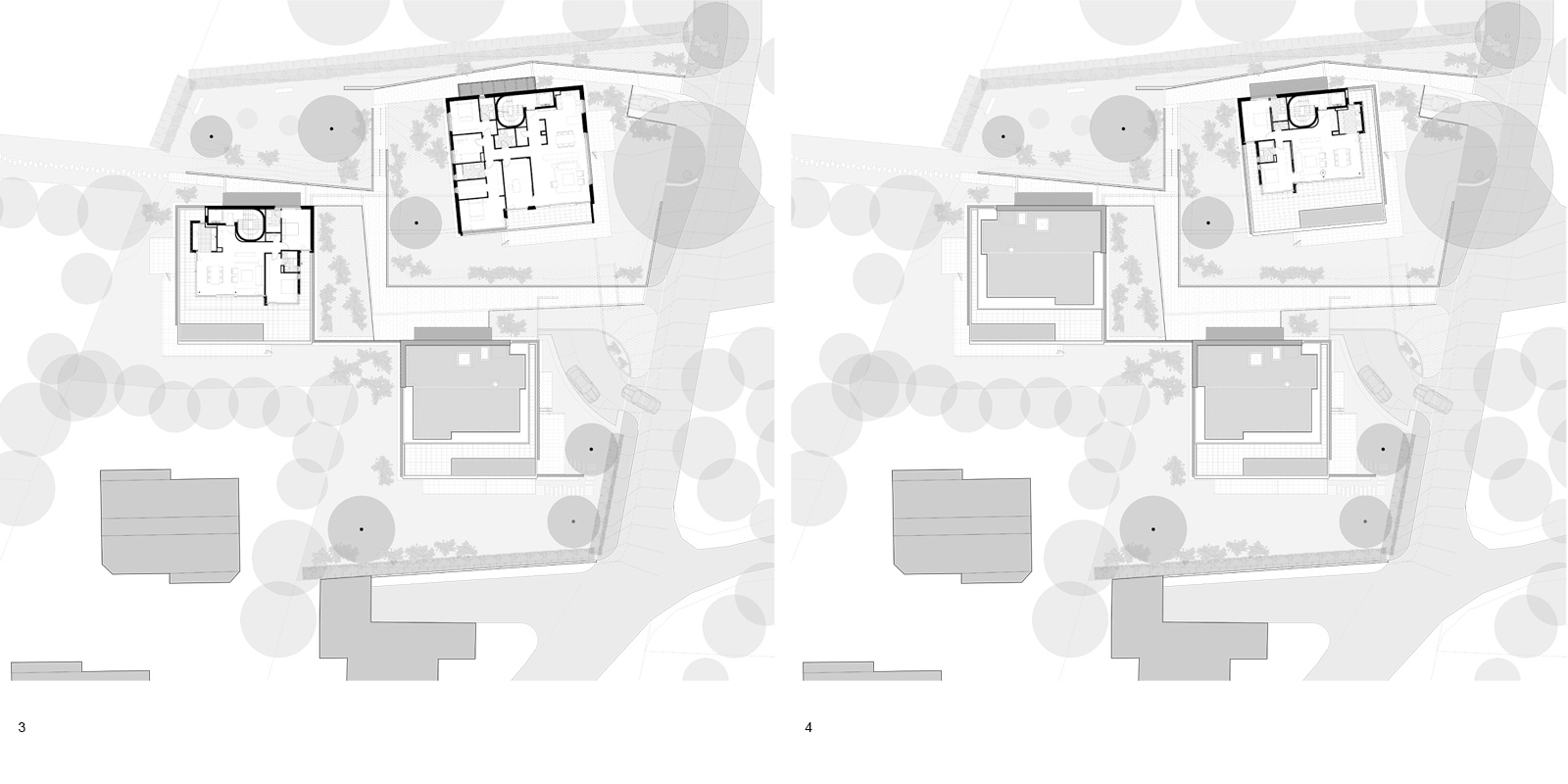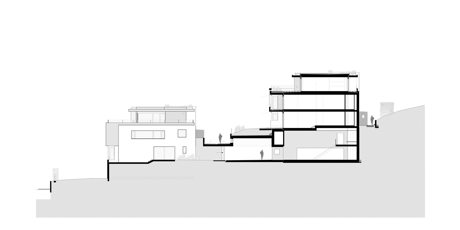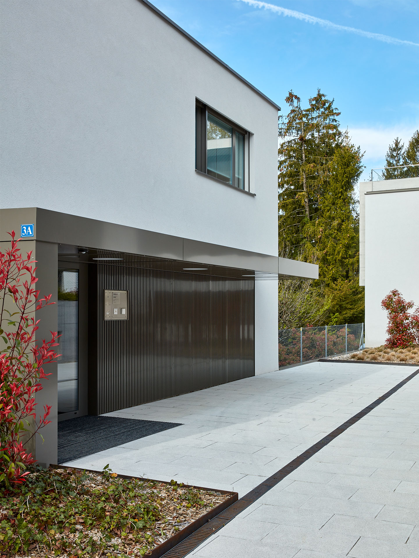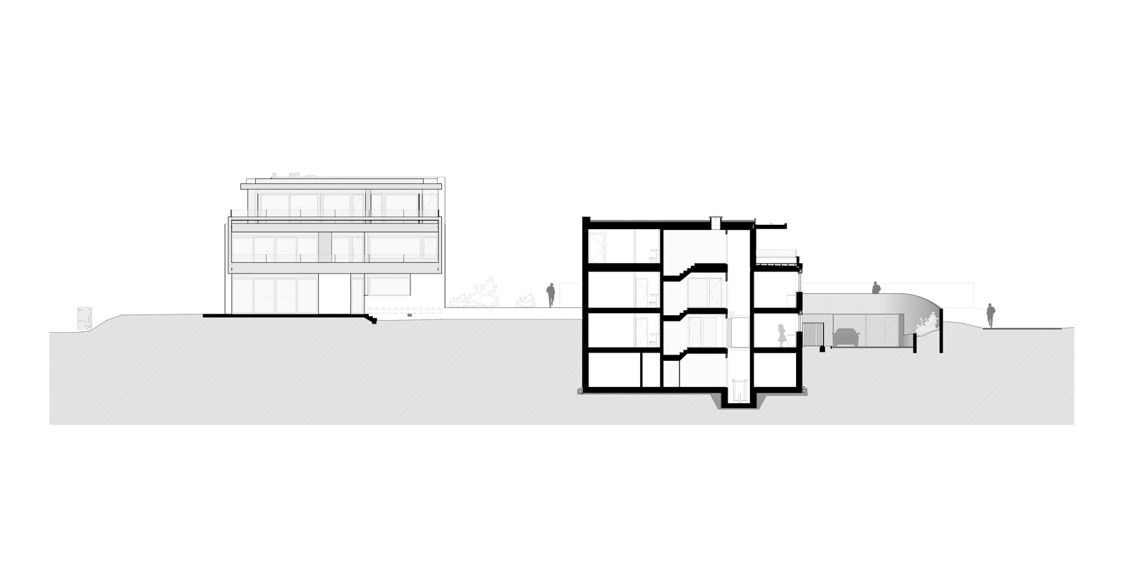 Situación e inscripción en el contexto : Los principales desafíos de este proyecto fueron integrar armoniosamente los tres edificios en un contexto de viviendas, sobre un terreno en pendiente y preservando un gran roble añejo. En aras de la unidad y la simplicidad, se implementó una lógica de repetición. Por lo tanto, colocar los tres volúmenes escalonados de forma natural en el terreno, ha permitido ofrecer a cada edificio una situación particular, para aprovechar al máximo la vista y su relación con el contexto inmediato. Como es el caso del edificio situado en la parte superior de la parcela, que goza de una cercanía privilegiada con el roble centenario. Cada piso se abre hacia tres lados. El frente sur ofrece una espléndida vista del paisaje, y la disposición escalonada evita la superposición con las fachadas laterales. El contexto, similar al de un área residencial a pesar de la presencia de unos pocos edificios, llevó a la estrategia de dar a cada volúmen la expresión de una villagrande en lugar de la de un edificio residencial. Es para este objetivo que cada piso desarrolla su propia expresión : la planta baja con sus terrazas, el piso con la logia y el ático que aparece como una vivenda en el techo.