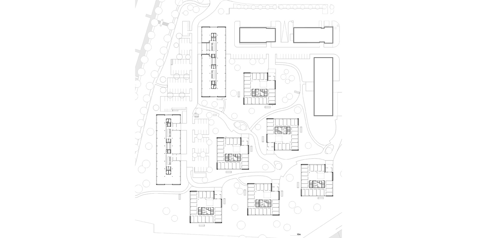 This new quarter of the EPFL campus was destined to provide office and laboratory space for companies that are working in conjunction with the school. In contrast to the character of the first phases of campus development in the late 1970s, focused on modular structures linked to an elevated pedestrian walkway, our interventions in the southern part of the campus proposed to rehabilitate the unbuilt natural terrain as a public space for circulation and as a setting for student life. Despite its relatively high density, the project reinforces that idea by distributing eight buildings in a natural landscape setting in such a way as to control the scale, spatial quality, and character of the interstitial public spaces.