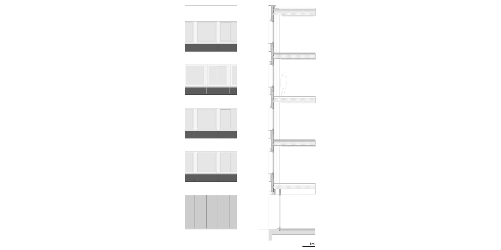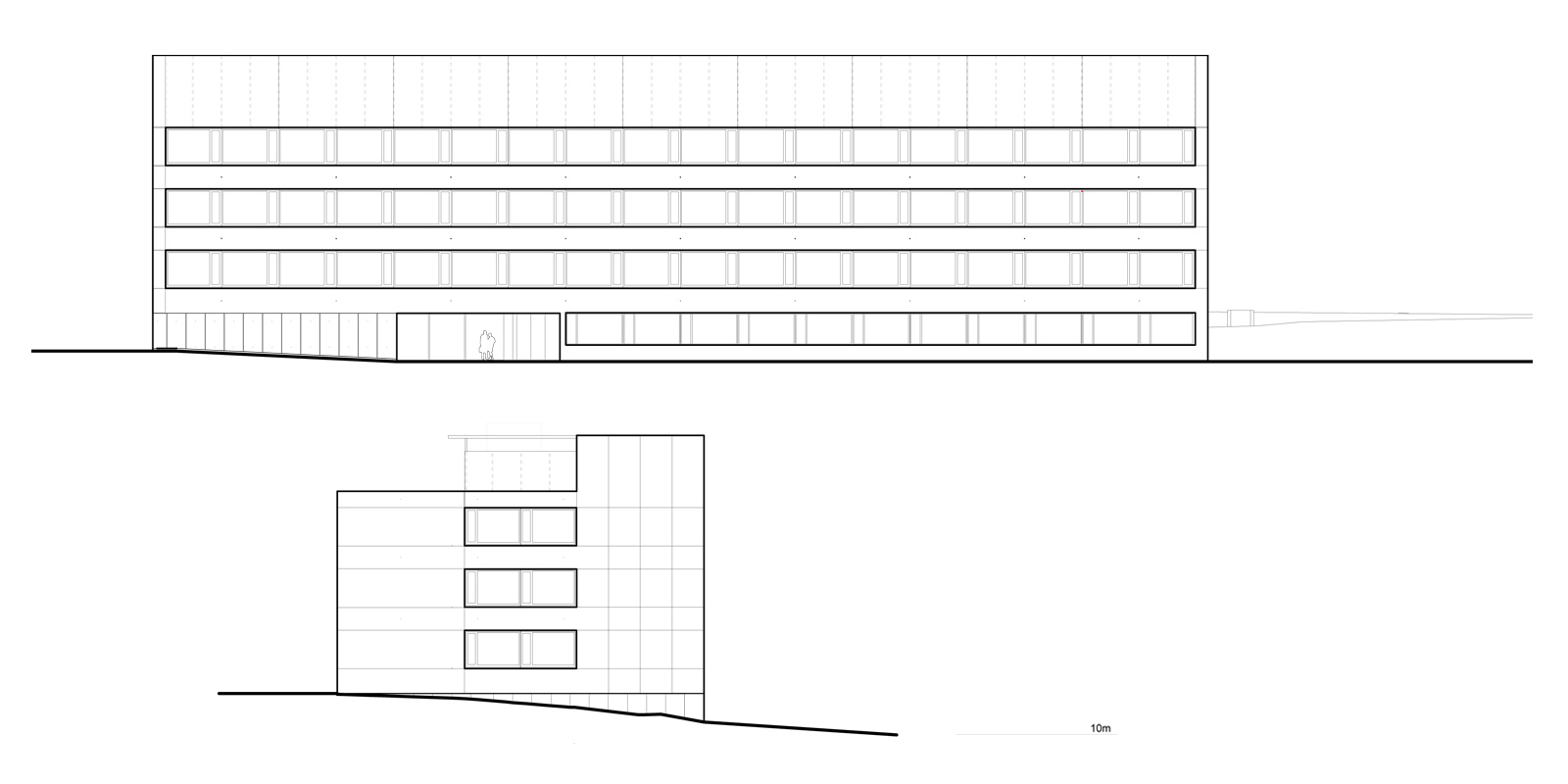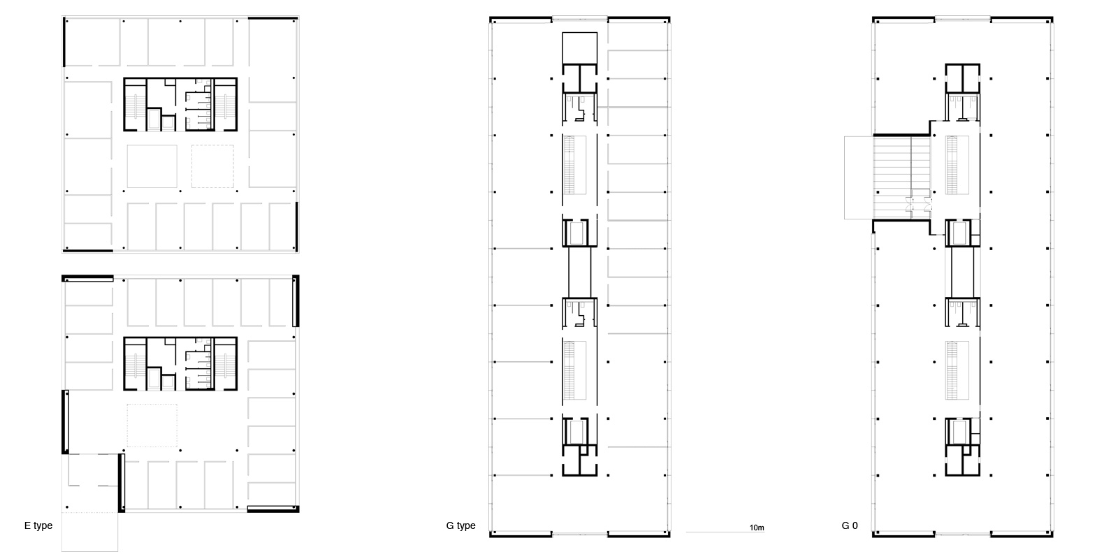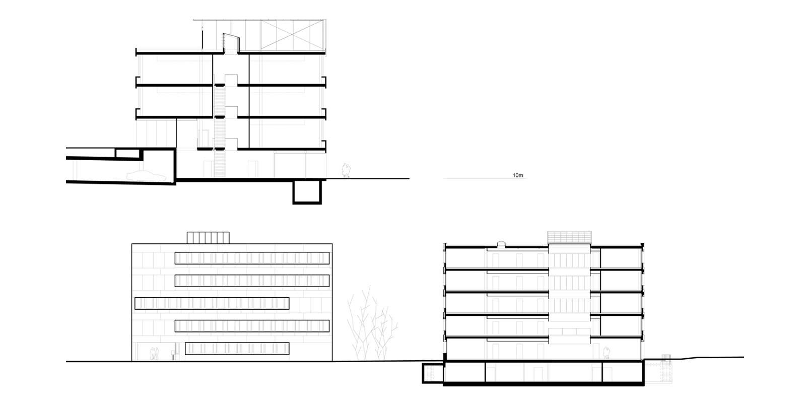 Two of the buildings designed for this quarter were intended to house laboratories. They establish border at the western edge of the ensemble, and are distinguished from the rest by their facades, which combine bare concrete with details in anodised natural aluminium in the openings and the technical attics.