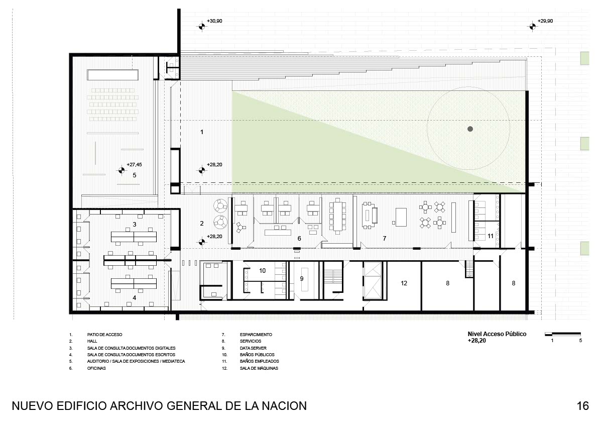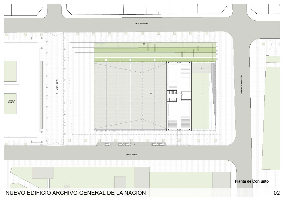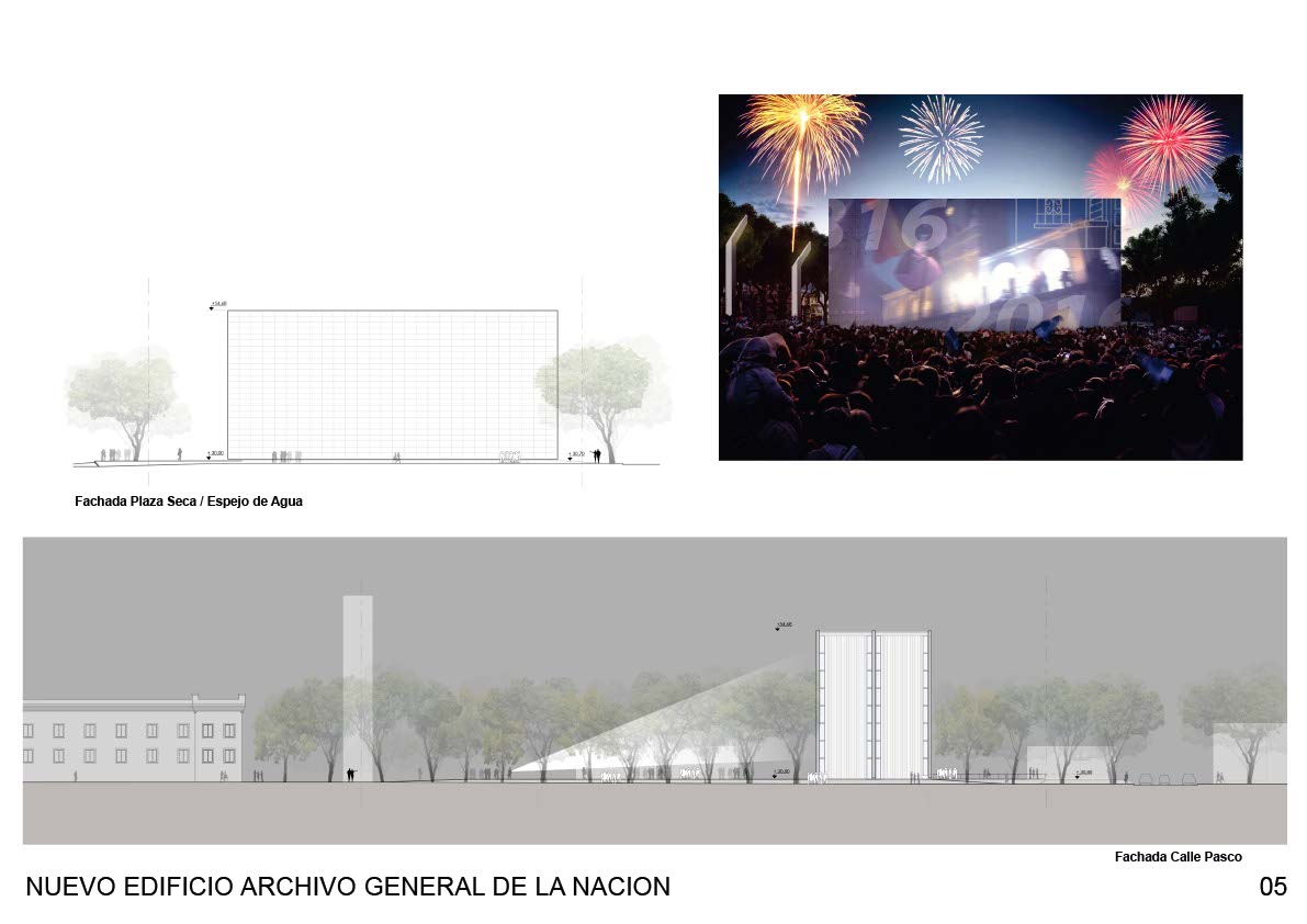 Hacia el sur el edificio deja un gran vacío urbano efímero, que dialoga con el edificio de la antigua cárcel de futuro uso público. En este espacio se extiende una gran superficie adoquinada que graba en el suelo la impronta del crecimiento futuro. En este espacio frágil e inasible, se extiende una fina capa de agua que define su uso cotidiano y contemplativo. En ocasiones, el agua se escurre y la explanada se convierte en un lugar público de eventos masivos; cine, ferias, recitales y conmemoraciones. El edificio ofrece su cara lisa como telón de fondo o pantalla de estos eventos. Un lugar de vida cívica, de encuentro y apertura que reemplaza a la cárcel demolida.
