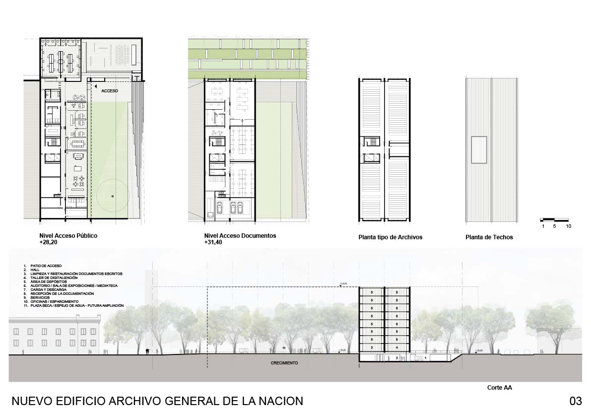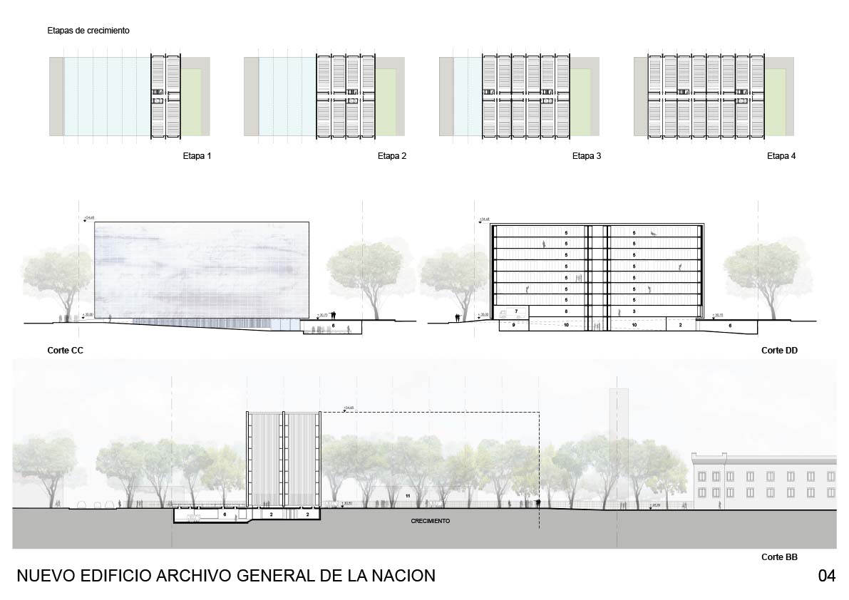El edificio se conforma de segmentos. Momentos de la historia que se acumulan. Hacia el norte, sobre 15 de noviembre, el edificio define una imagen perenne. Una gran placa suspendida sobre el jardín de acceso publico. El trabajo material alude a la acumulación de marcas en el tiempo, visualizando esa profundidad. Hacia el sur el edificio presenta una cara ciega y austera que será reemplazada por otra en su crecimiento. Esta cara es el presente, la acción. En ella el tiempo transcurre en imágenes, en ella nada se acumula. En los laterales el edificio se abre, su urbanidad es doblemente metafórica. Sus muros funcionan como medianeras que, cada 10 varas, aluden al carácter de nuestra ciudad densa, consolidada. El contenido es la acumulación de páginas de historia.