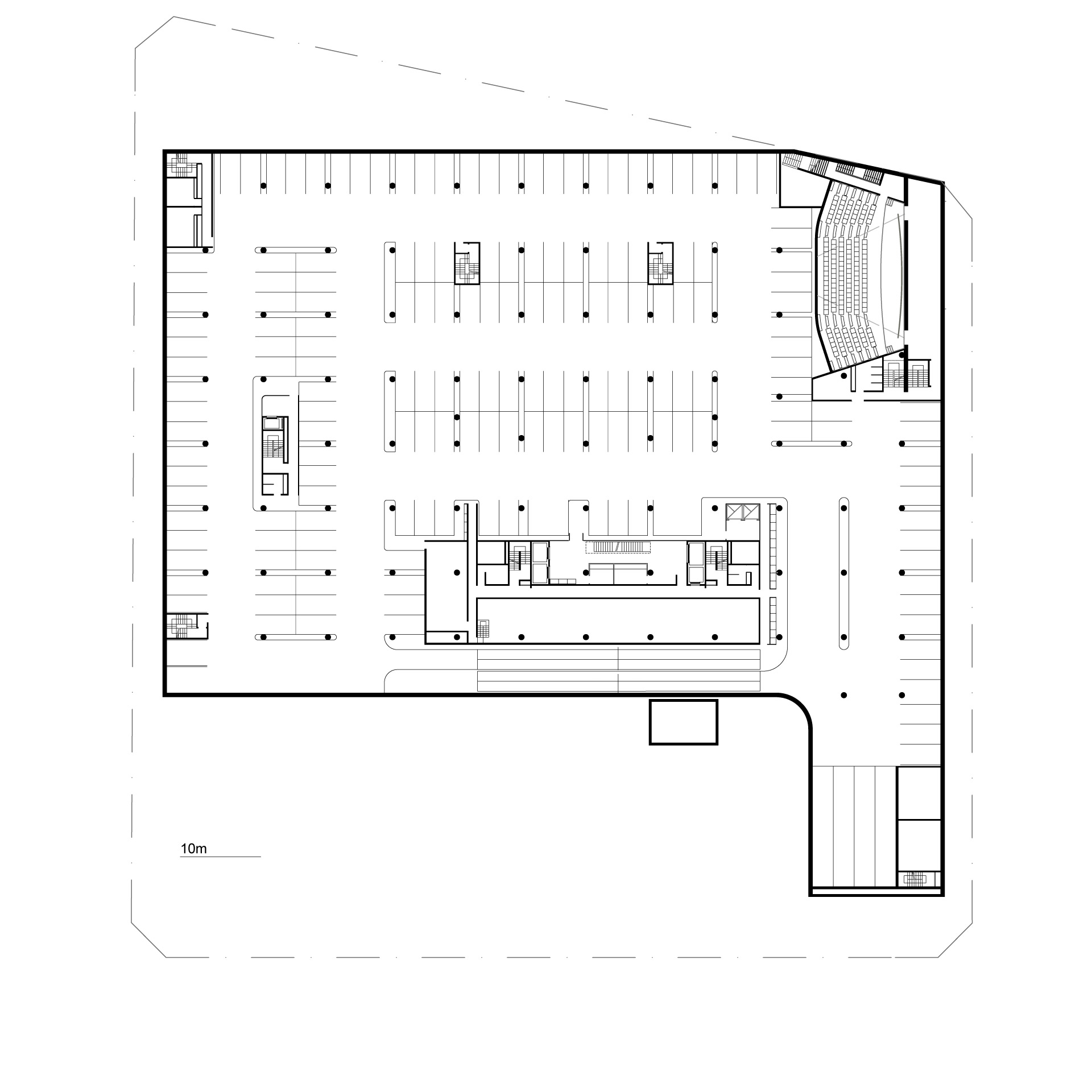 El volumen ocupa el centro de manzana reposando sobre un zócalo que resuelve espacialmente la pendiente del sitio y alberga las funciones anexas con sus diferentes accesos, como así también, la futura ampliación del edificio.