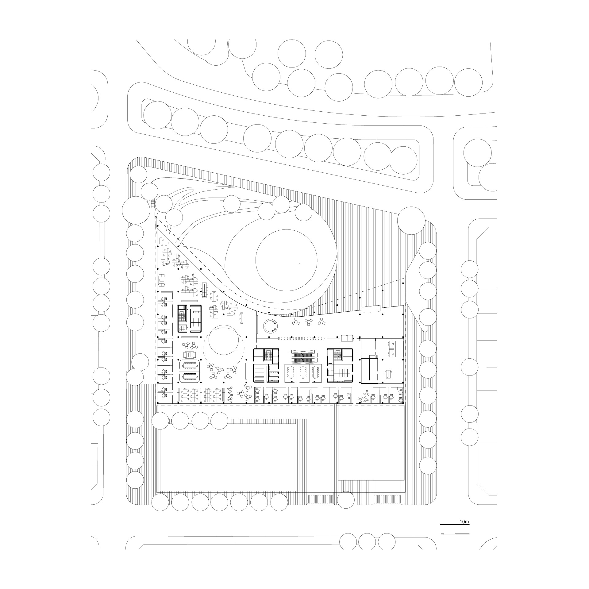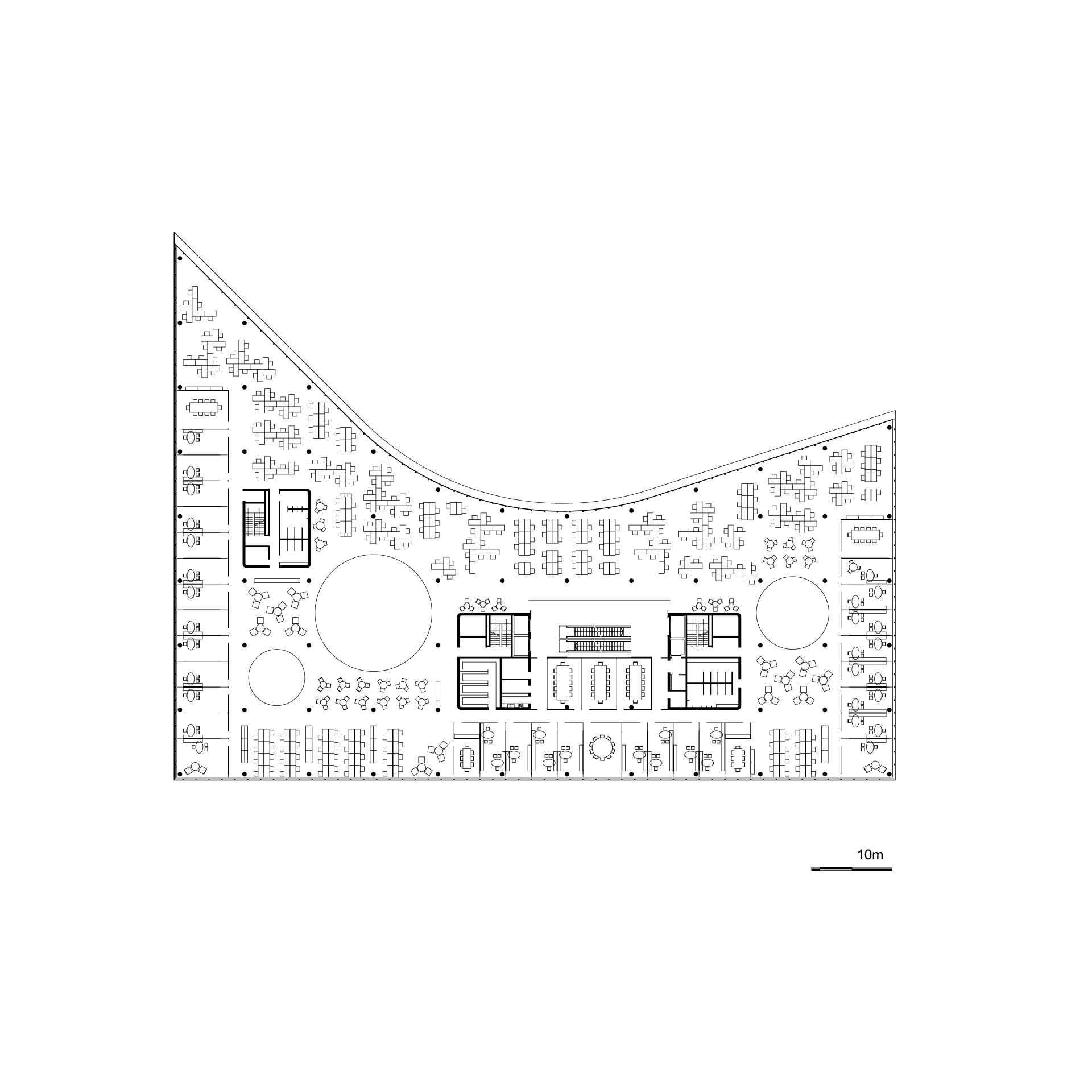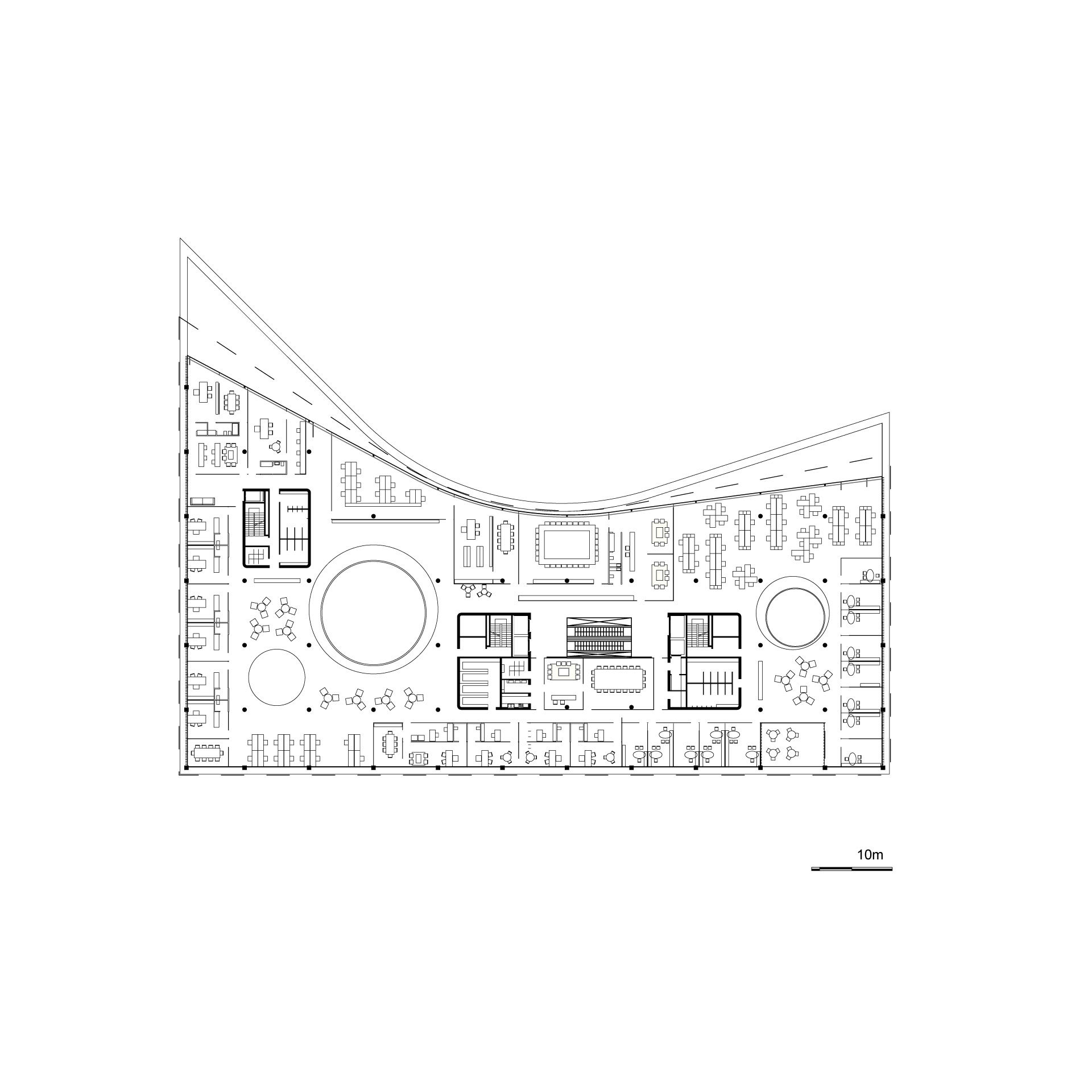 Además de la mencionada zona de oficinas abiertas que aloja la mayoría de los puestos de trabajo con vistas al parque, la planta tipo propone, a lo largo de sus tres fachadas rectas, sectores, ideales para oficinas privadas, oficinas de grupo o salas de reuniones.
