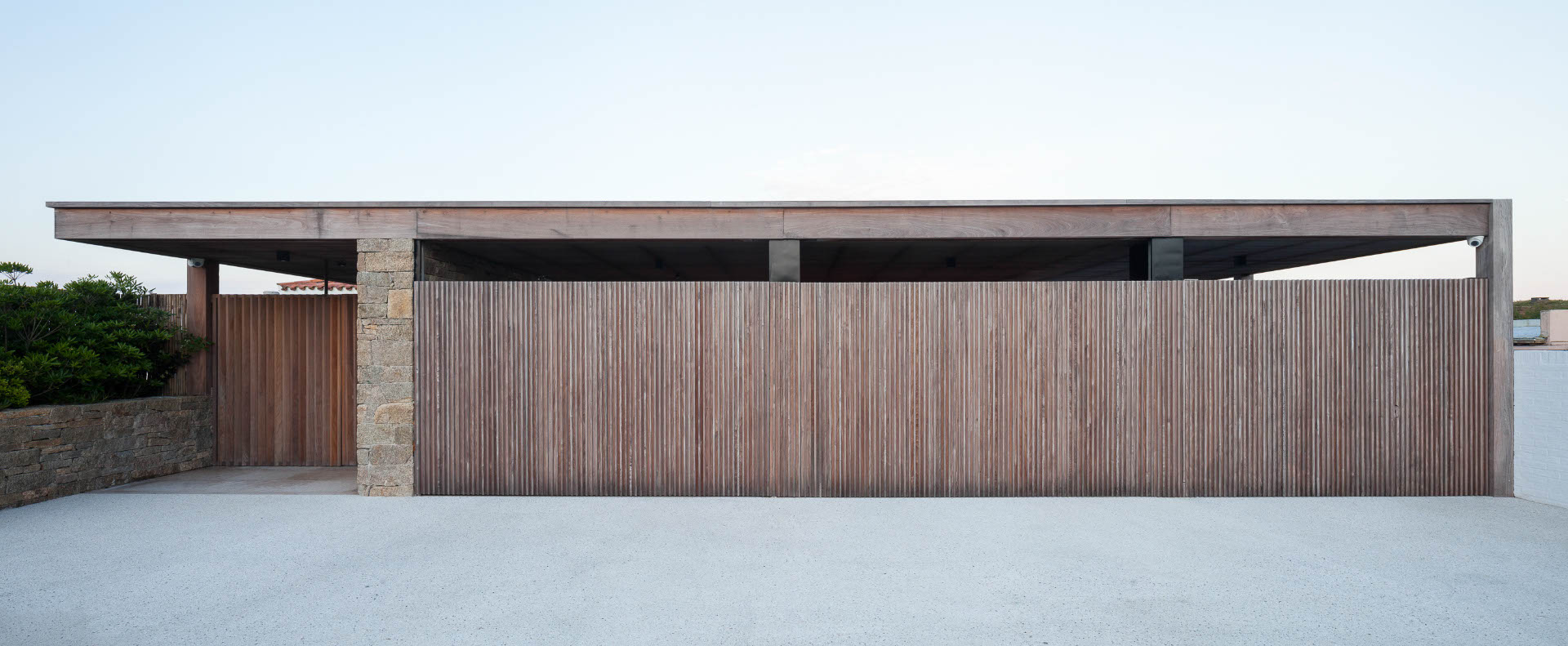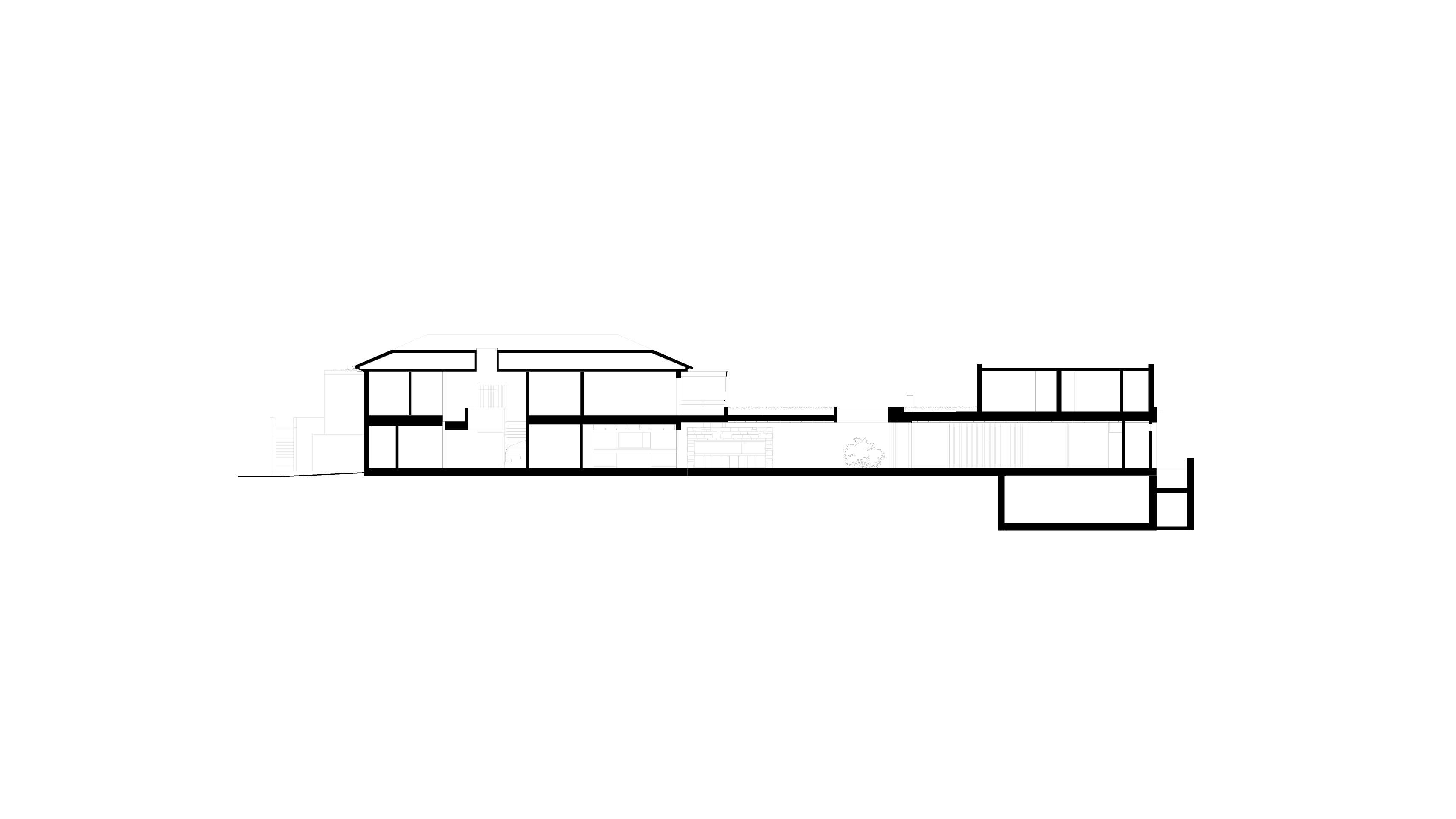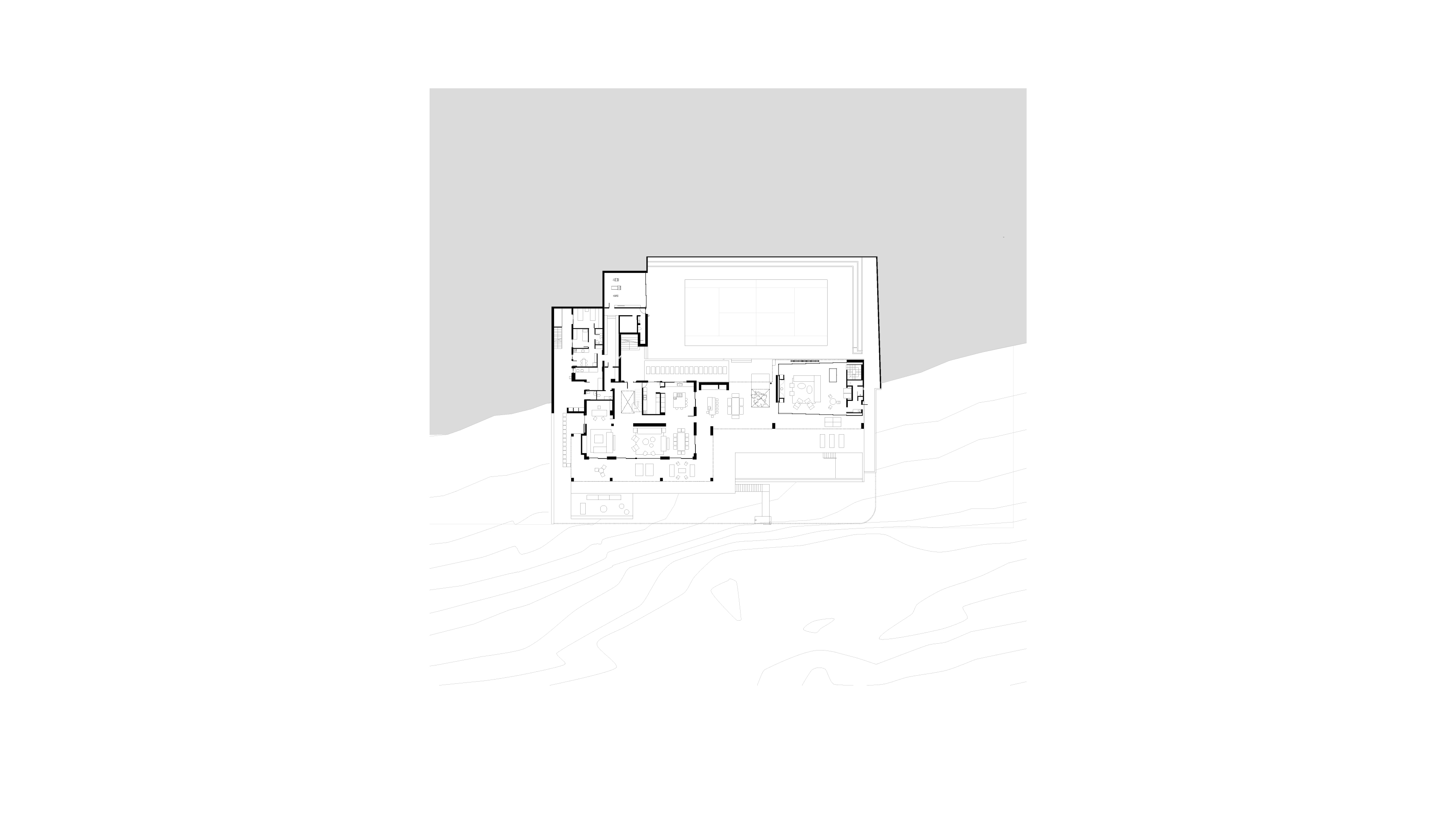 El proyecto mantiene los criterios distributivos originales, con una planta alta para el área privada de dormitorios a nivel de la calle vehicular de acceso, y una planta baja con las áreas públicas y sus terrazas vinculadas con espacios deportivos y de esparcimiento. La nueva intervención busca la continuidad con la existente mediante una losa que se une al volumen original y envuelve al conjunto con una viga perimetral a modo de cinta. Un sistema de pérgolas y construcciones de madera completan las protecciones solares hacia el oeste en planta alta y cubren el acceso desde la calle. Los muros de piedra actúan como grandes zócalos para apoyarse en el terreno desde la playa, continuando hacia el frente opuesto a modo de cantero y tabique de contención.