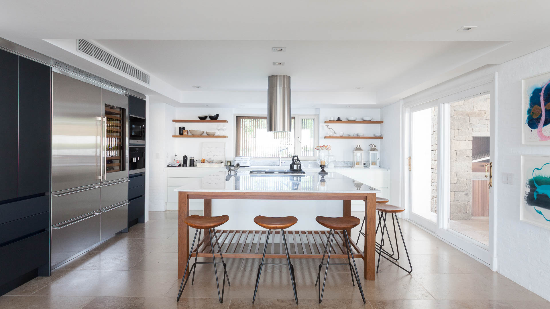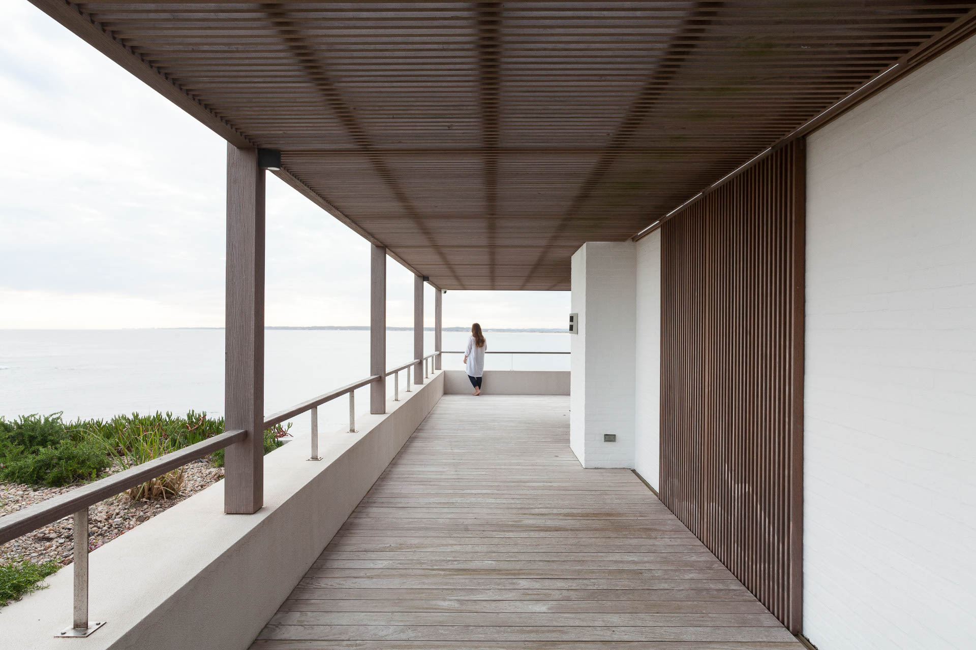 El límite interior-exterior se regula con la apertura total de las carpinterías, generando grandes espacios de uso en verano, cuando la casa es ocupada para fiestas y vacaciones. Los vínculos desde la playa hacia la pileta, terrazas, galerías y áreas de estar, y seguidamente hacia las áreas de dormitorios en planta alta se conciben como transiciones graduales que definen formas muy diferenciadas de privacidad, pero que al mismo tiempo van recuperando en cada instancia un modo de asociarse con el paisaje a través de vistas y expansiones semicubiertas.