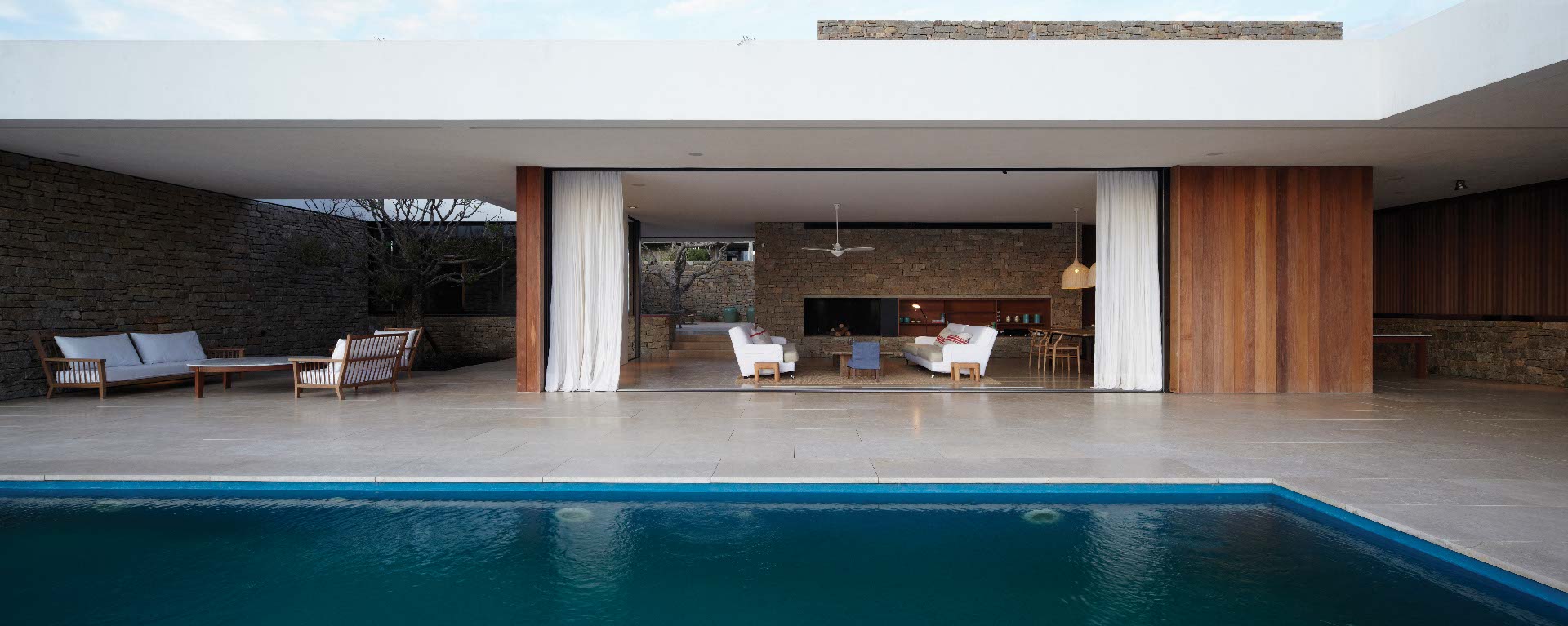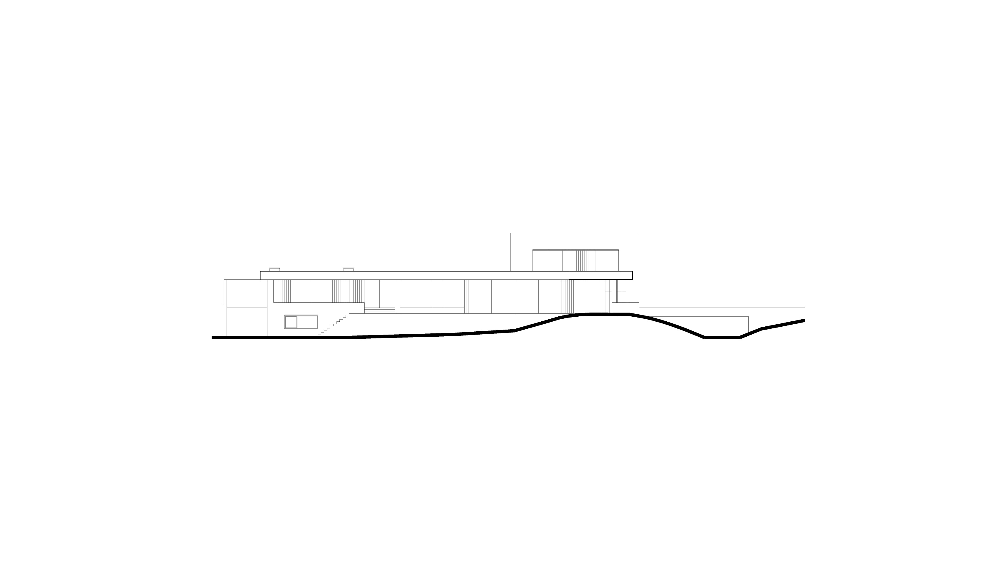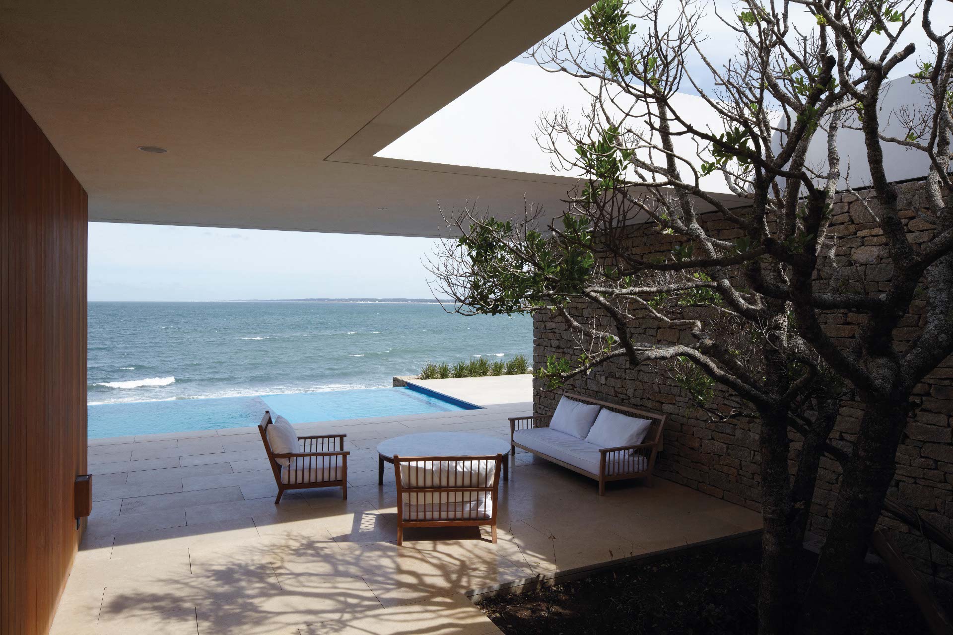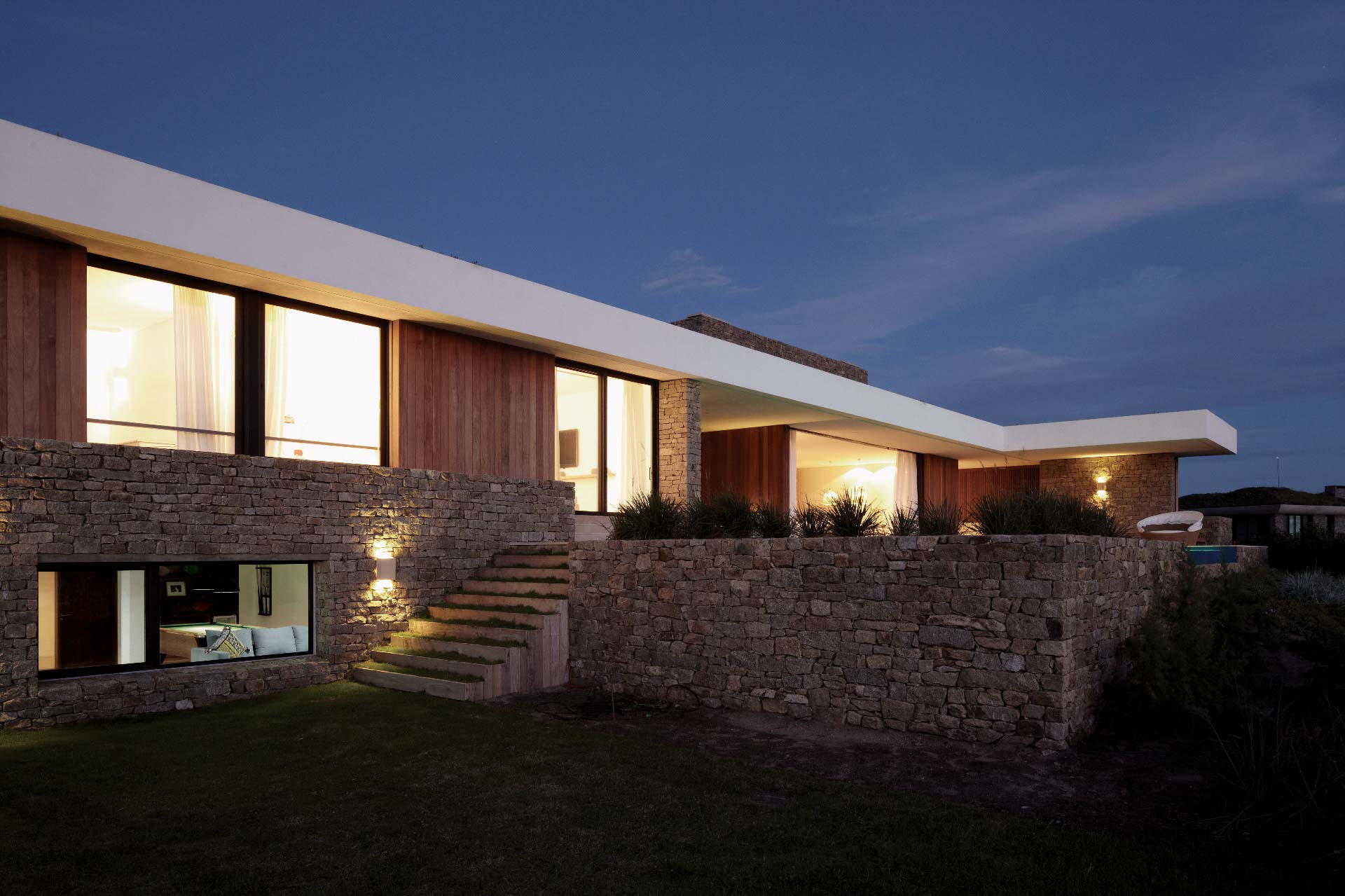 Esta vivienda familiar de vacaciones, con uso continuo en verano y puntual en invierno, se ubica junto al mar en un solar privilegiado sobre la playa mansa de José Ignacio. El sitio presenta una pendiente moderada hacia el mar y las vistas principales en dirección oeste hacia la puesta del sol. Por uno de sus laterales, hacia el sur, se encuentra una de las calles de acceso a la playa muy transitada en verano. El programa se desarrolla casi totalmente en una sola planta que se va escalonando levemente siguiendo la pendiente natural del terreno. La casa está formada por una serie de pabellones de muros de piedra, separados por patios y cubiertos por una gran losa vegetada. Este techo jardín es un potente gesto horizontal que relaciona la casa con el atardecer del horizonte marino. Ambos elementos definen el área social de la casa como una secuencia de espacios exteriores, interiores y semi-cubiertos que se relacionan entre sí creando diversas condiciones de uso adaptadas a las variables climáticas del lugar. Los grandes ventanales corredizos permiten vivir la casa en verano como un gran espacio de sombra exterior. La casa se consolida en el alzado sur, ubicando allí las funciones de servicio, buscando protegerse del viento y de la calle de acceso público a la playa. La torre en la esquina define su discreta presencia en el paisaje del pueblo de José Ignacio.