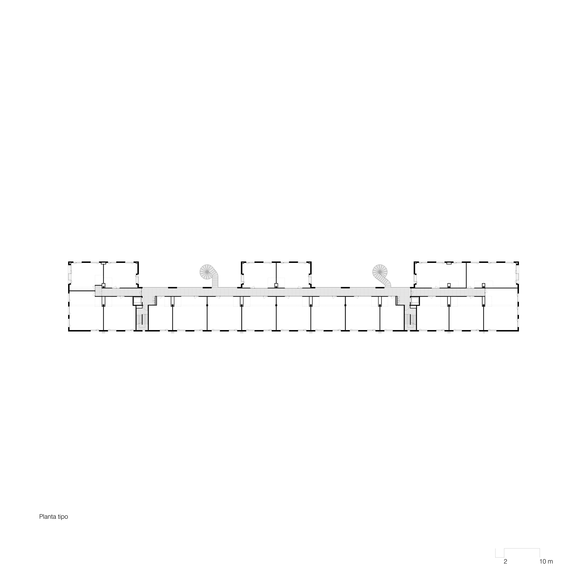 La fusión de estructura, fachada y protección solar optimiza recursos y libera un espacio regular para un programa administrativo, de flexibilidad corporativa y/o múltiple, que permite explorar un principio que admite crecimiento y cambios dentro de una misma envolvente. Las plantas se organizan en cada nivel como espacios libres complementados por un núcleo central, divisibles según la disposición de las seis columnas interiores, conformando una trama integral de espacios de trabajo flexibles.
