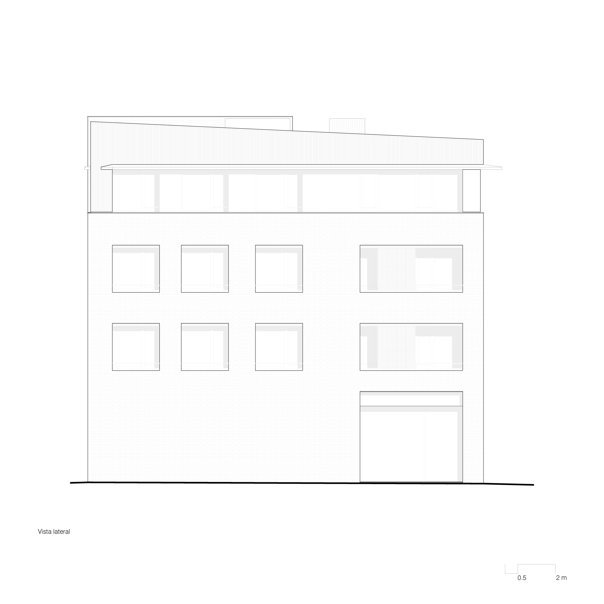 La estructura perimetral se exterioriza y envuelve al volumen en una grilla que organiza las cargas, protege de forma consciente al interior de la exposición climática directa y le otorga un lenguaje arquitectónico al edificio. Este sistema organiza un espesor de profundidad de 1.30 m respecto de la fachada interna, que define espacios intermedios de sombra regulados además por una serie de parasoles horizontales que completan la protección solar de la superficie de vidrio, reducida además al área necesaria por la inclusión de un antepecho ciego bajo el plano de trabajo.