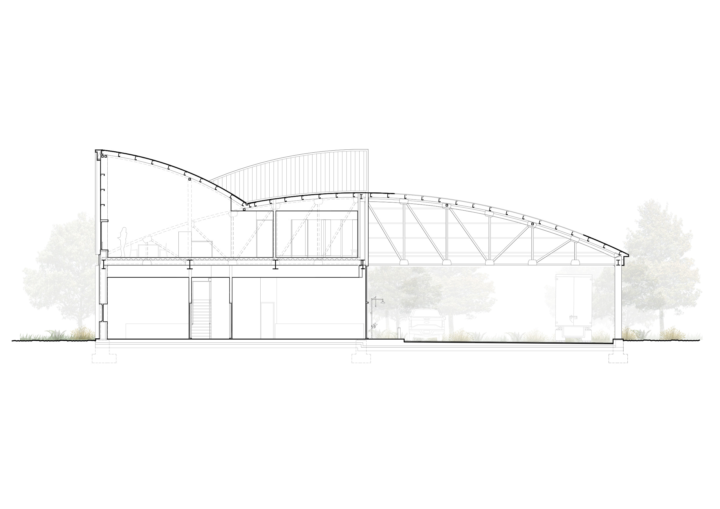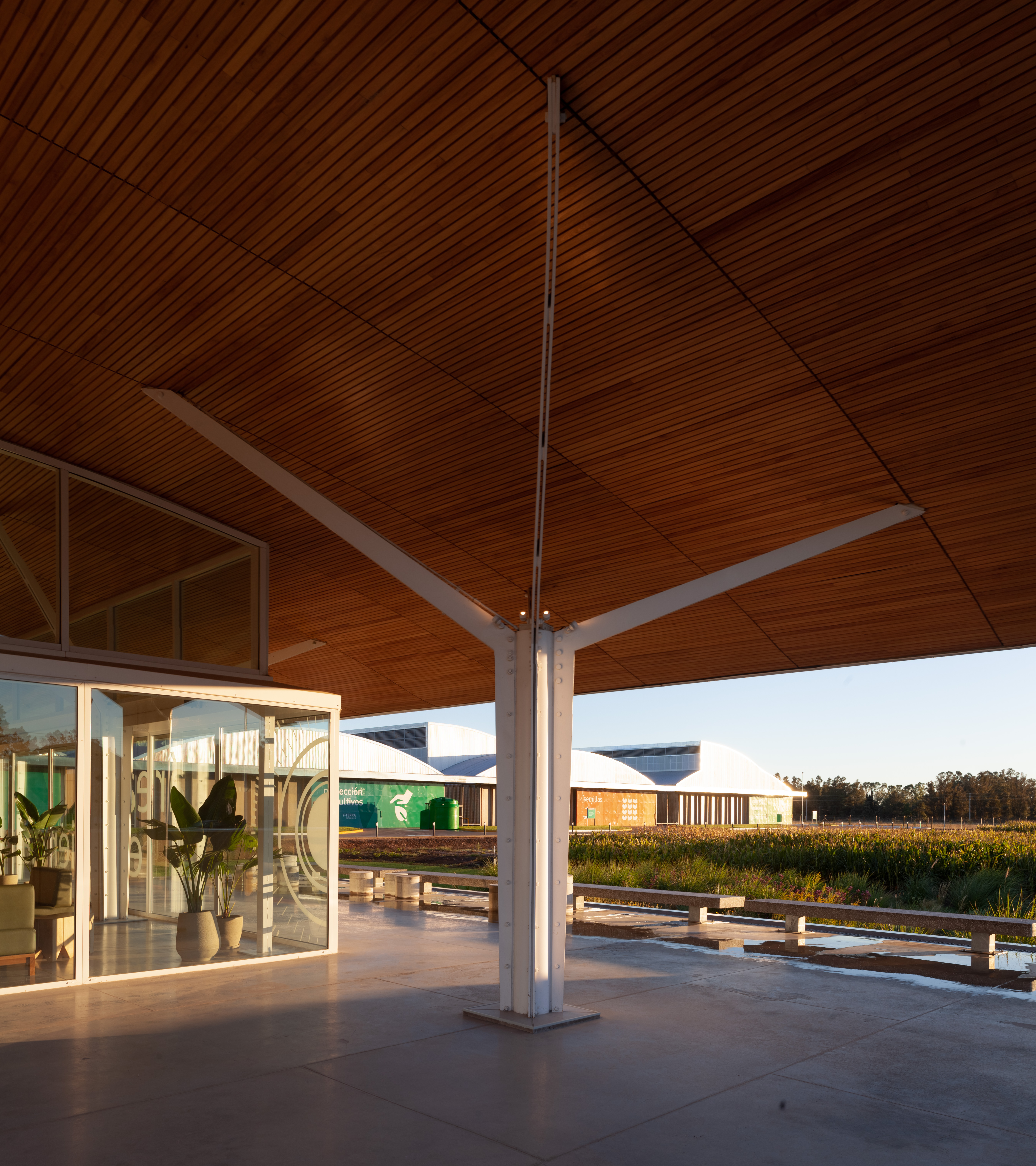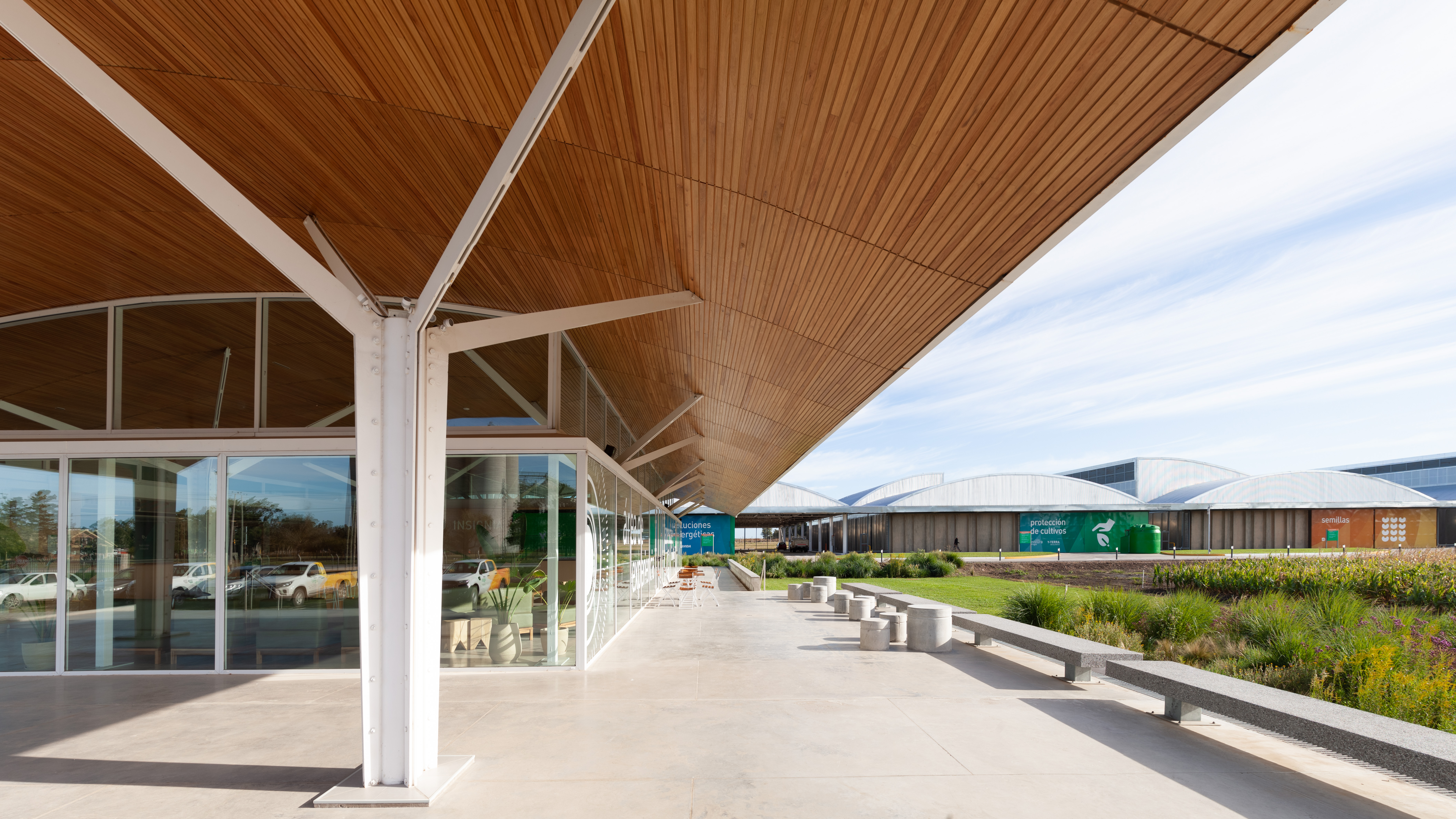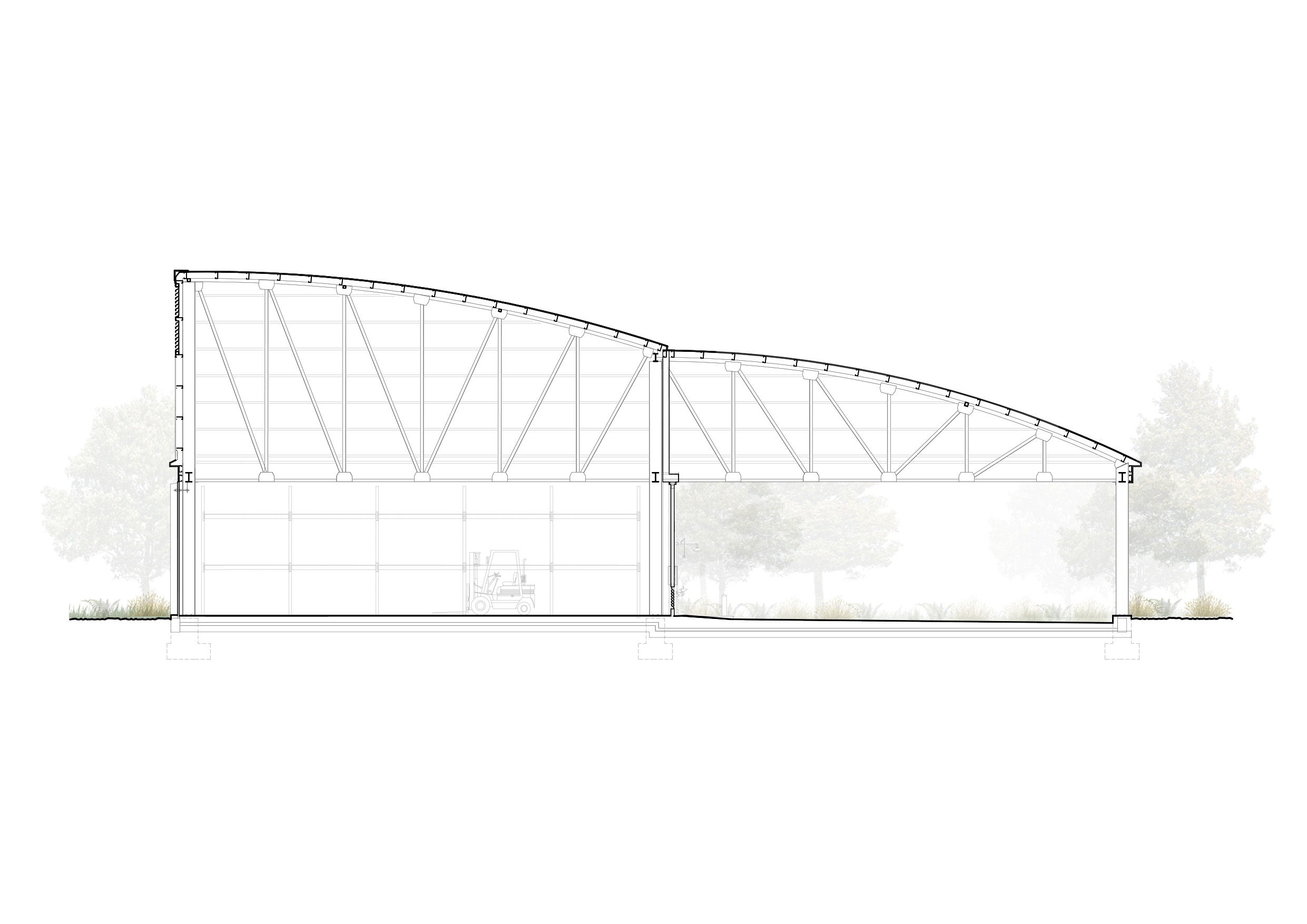 Este edificio singular, retoma una forma clásica de la arquitectura rural, el tinglado. Pero en este caso la bóveda se presenta como una lámina curva que parece levitar sobre el parque. Es una versión moderna, liviana, abierta, y cálida del galpón. Mantiene la sencillez modular de la arquitectura industrial, permitiendo su construcción simple, ajustada y controlada.