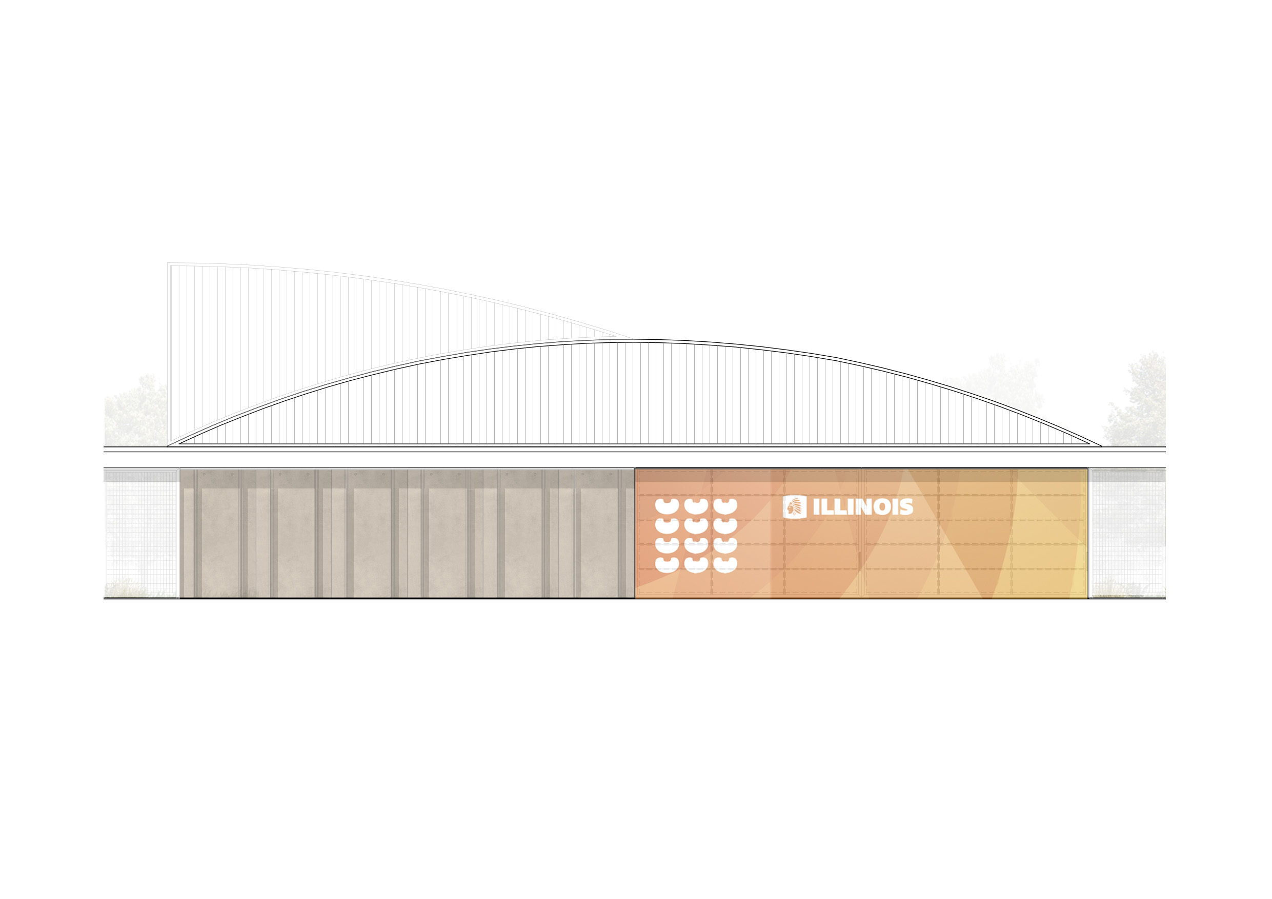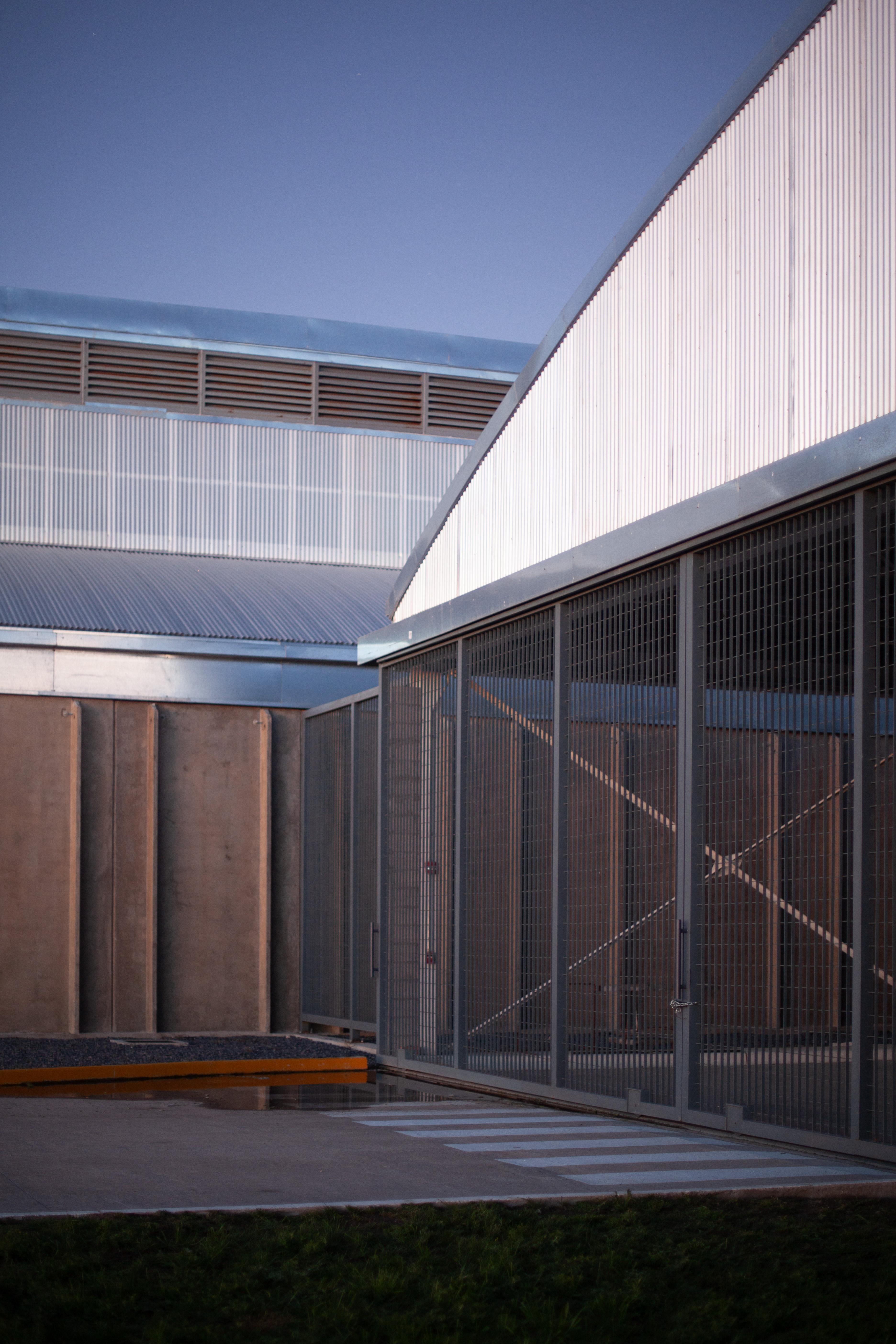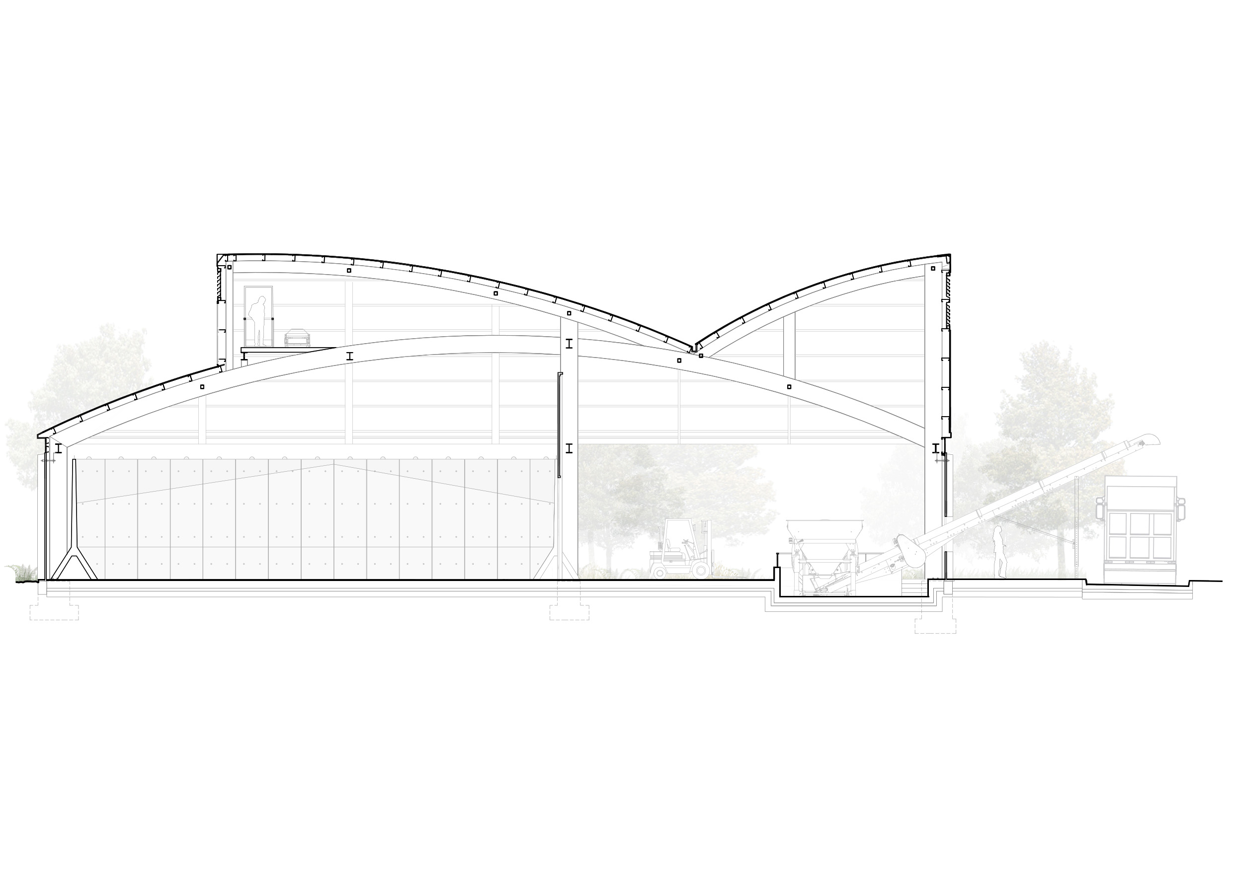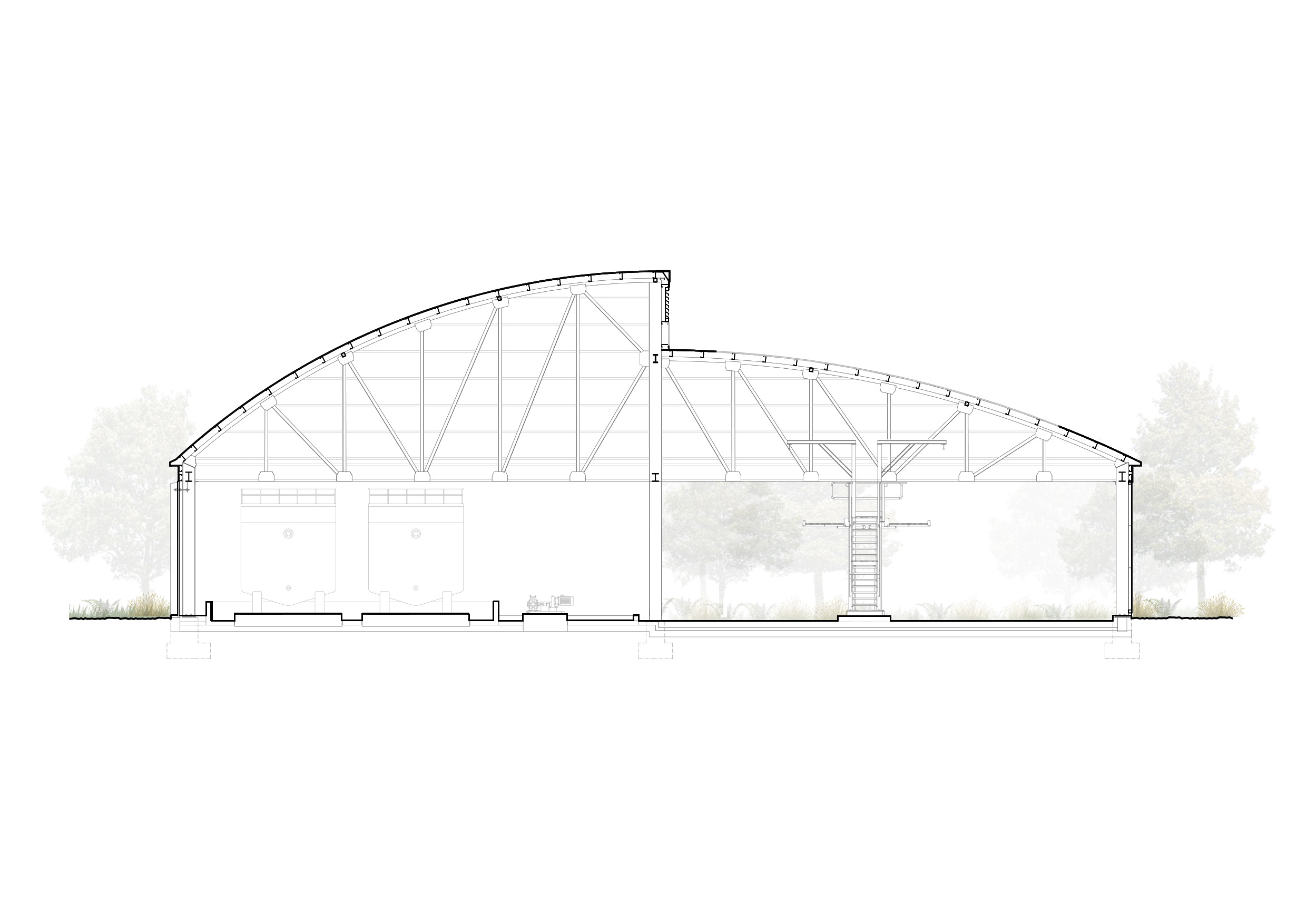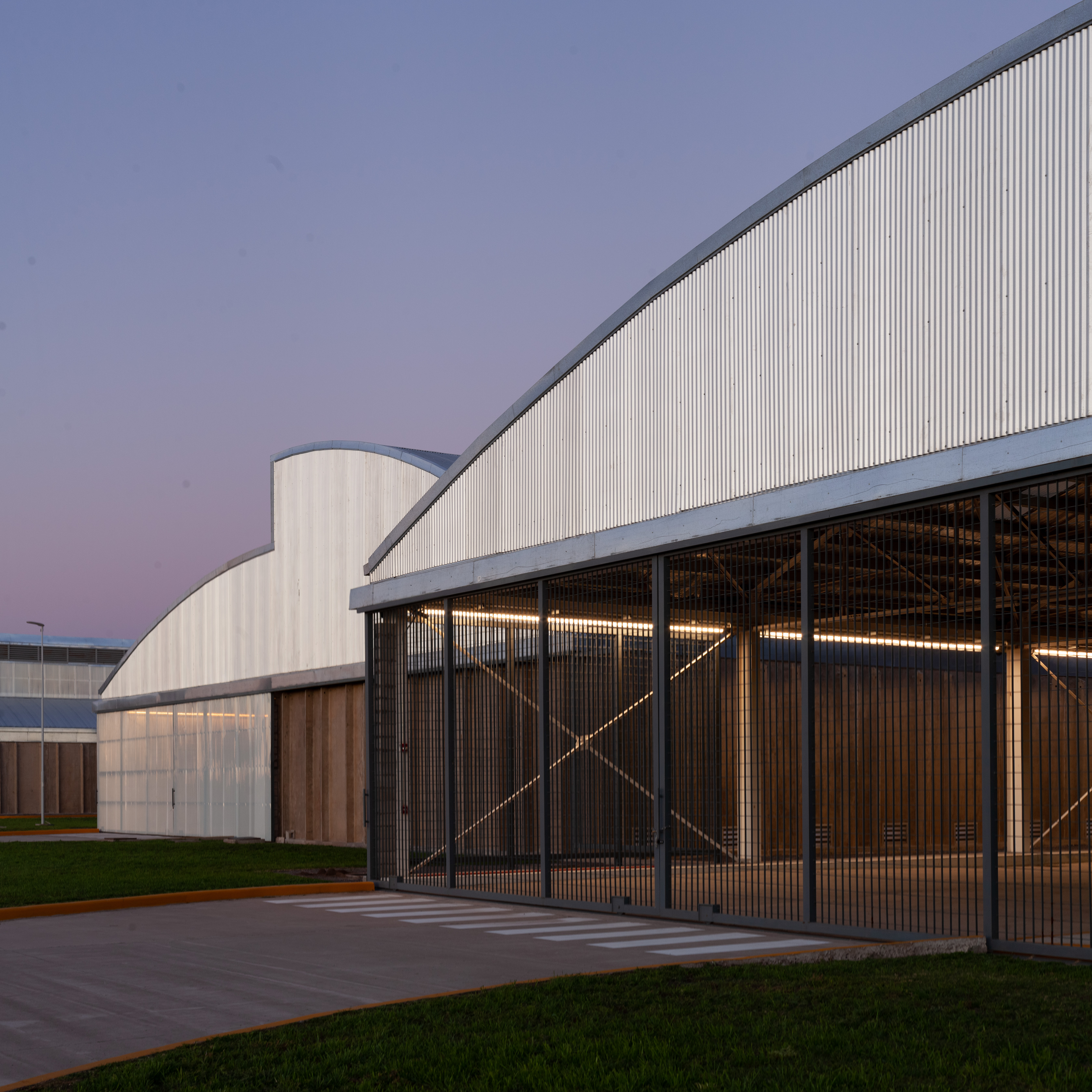 Este edificio singular, retoma una forma clásica de la arquitectura rural, el tinglado. Pero en este caso la bóveda se presenta como una lámina curva que parece levitar sobre el parque. Es una versión moderna, liviana, abierta, y cálida del galpón. Mantiene la sencillez modular de la arquitectura industrial, permitiendo su construcción simple, ajustada y controlada.