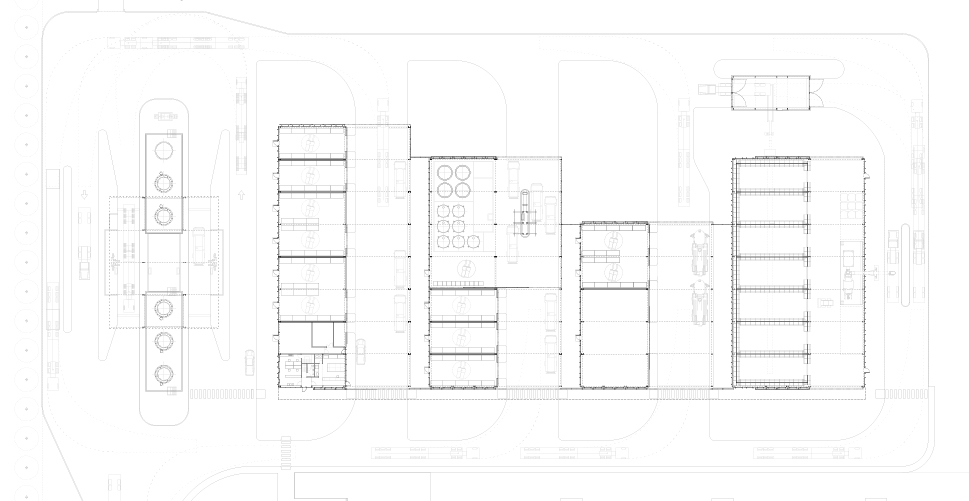 El módulo de 35 m. de ancho se compone de 3 elementos, una nave cerrada, un espacio de maniobras, y un patio. Un módulo estructural regular de 15mts de luz cubre tanto la nave cerrada como el espacio de maniobras. El patio activo de 5 metros completa el sistema. Este sistema lineal nos permite un crecimiento de las instalaciones asegurando condiciones de uso en toda su longitud.
