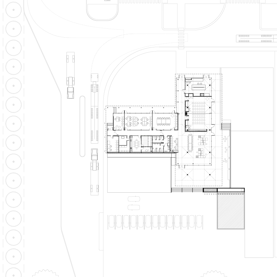 Esta cubierta alberga los espacios flexibles y multifuncionales claves para las actividades sociales, educativas y comerciales del campus. Estos espacios están fuertemente conectados funcional y visualmente con el parque a través de una galería y una gran terraza.