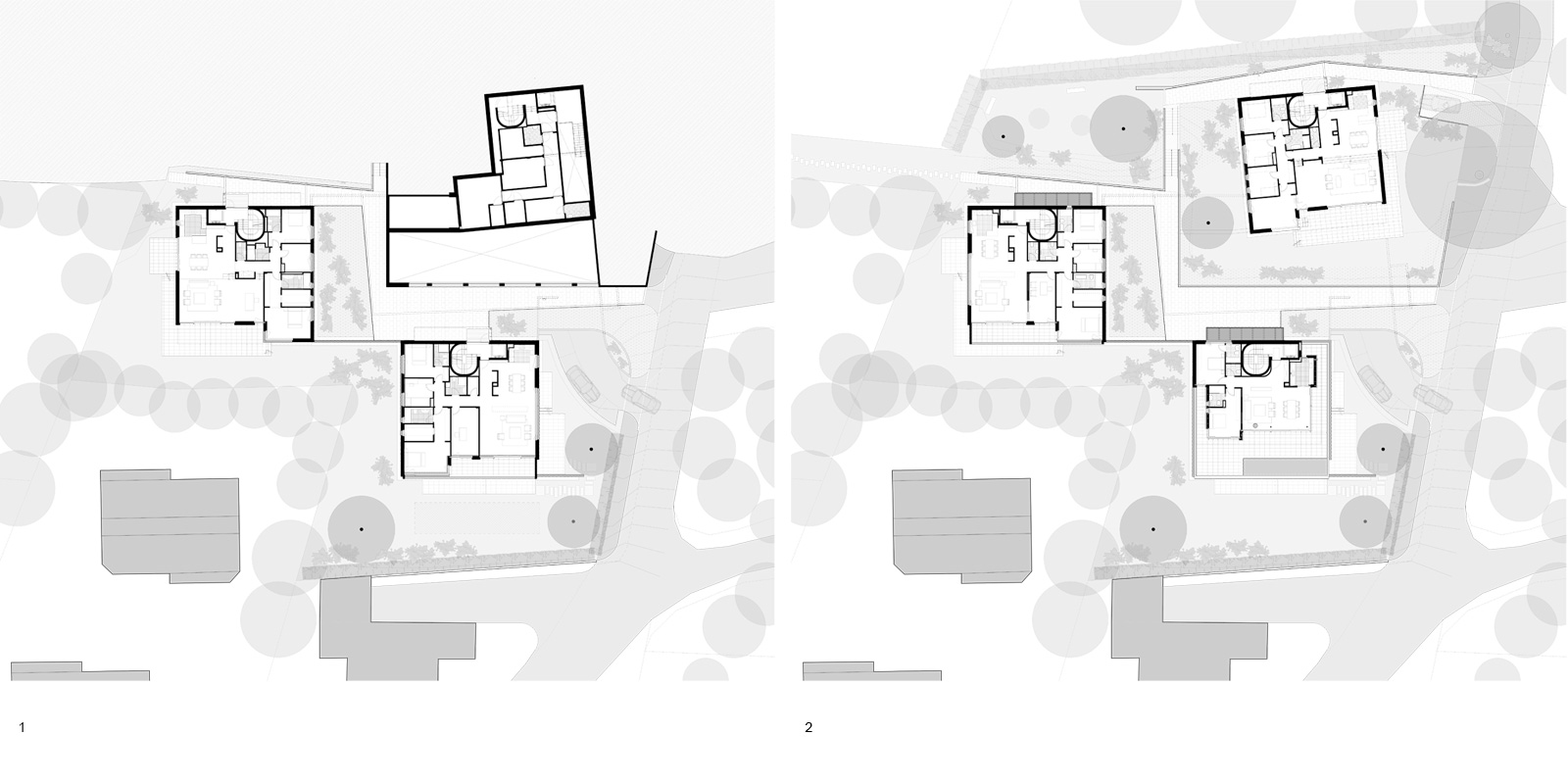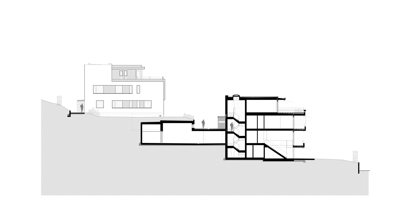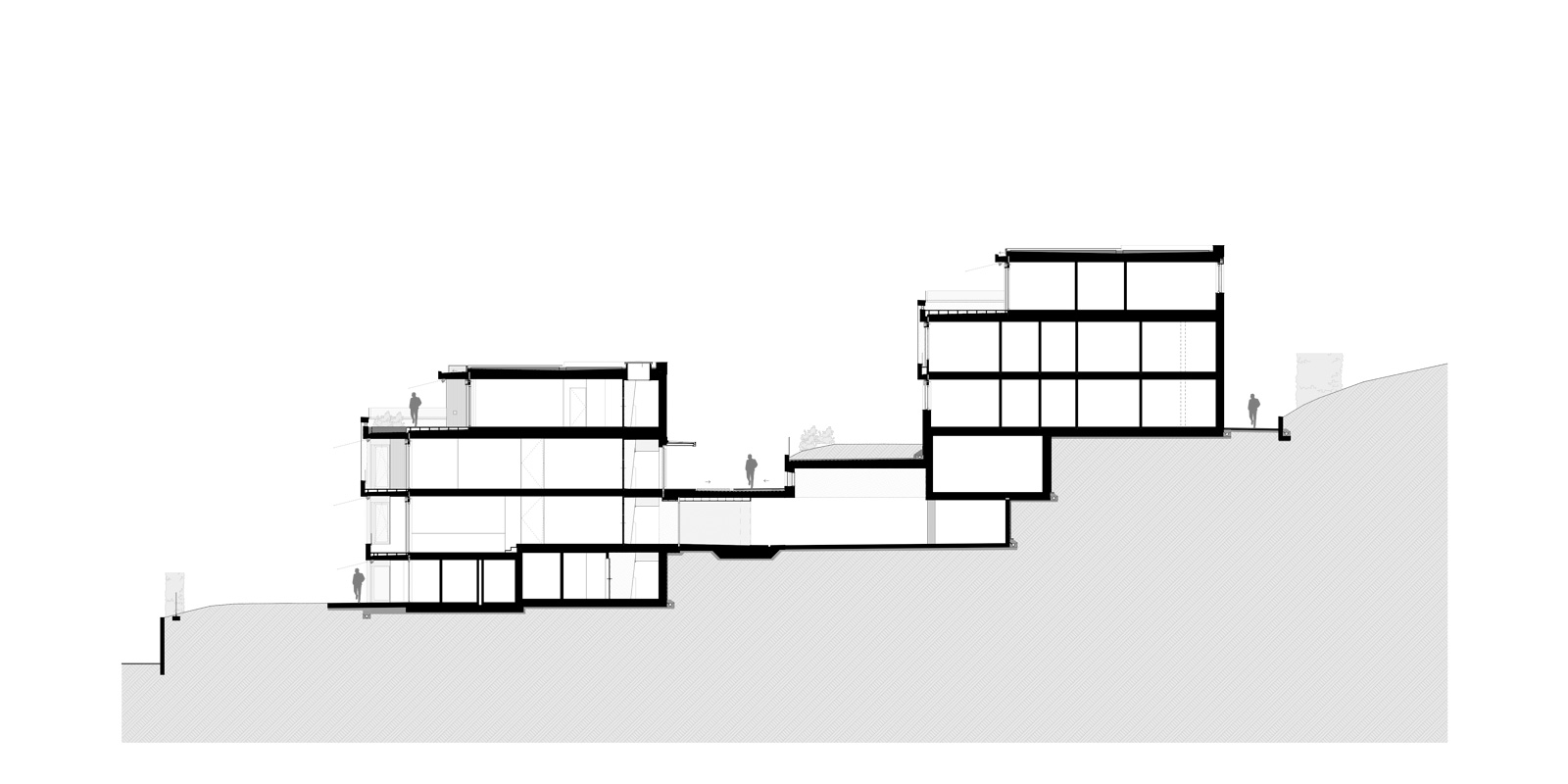Situación e inscripción en el contexto : Los principales desafíos de este proyecto fueron integrar armoniosamente los tres edificios en un contexto de viviendas, sobre un terreno en pendiente y preservando un gran roble añejo. En aras de la unidad y la simplicidad, se implementó una lógica de repetición. Por lo tanto, colocar los tres volúmenes escalonados de forma natural en el terreno, ha permitido ofrecer a cada edificio una situación particular, para aprovechar al máximo la vista y su relación con el contexto inmediato. Como es el caso del edificio situado en la parte superior de la parcela, que goza de una cercanía privilegiada con el roble centenario. Cada piso se abre hacia tres lados. El frente sur ofrece una espléndida vista del paisaje, y la disposición escalonada evita la superposición con las fachadas laterales. El contexto, similar al de un área residencial a pesar de la presencia de unos pocos edificios, llevó a la estrategia de dar a cada volúmen la expresión de una villagrande en lugar de la de un edificio residencial. Es para este objetivo que cada piso desarrolla su propia expresión : la planta baja con sus terrazas, el piso con la logia y el ático que aparece como una vivenda en el techo.