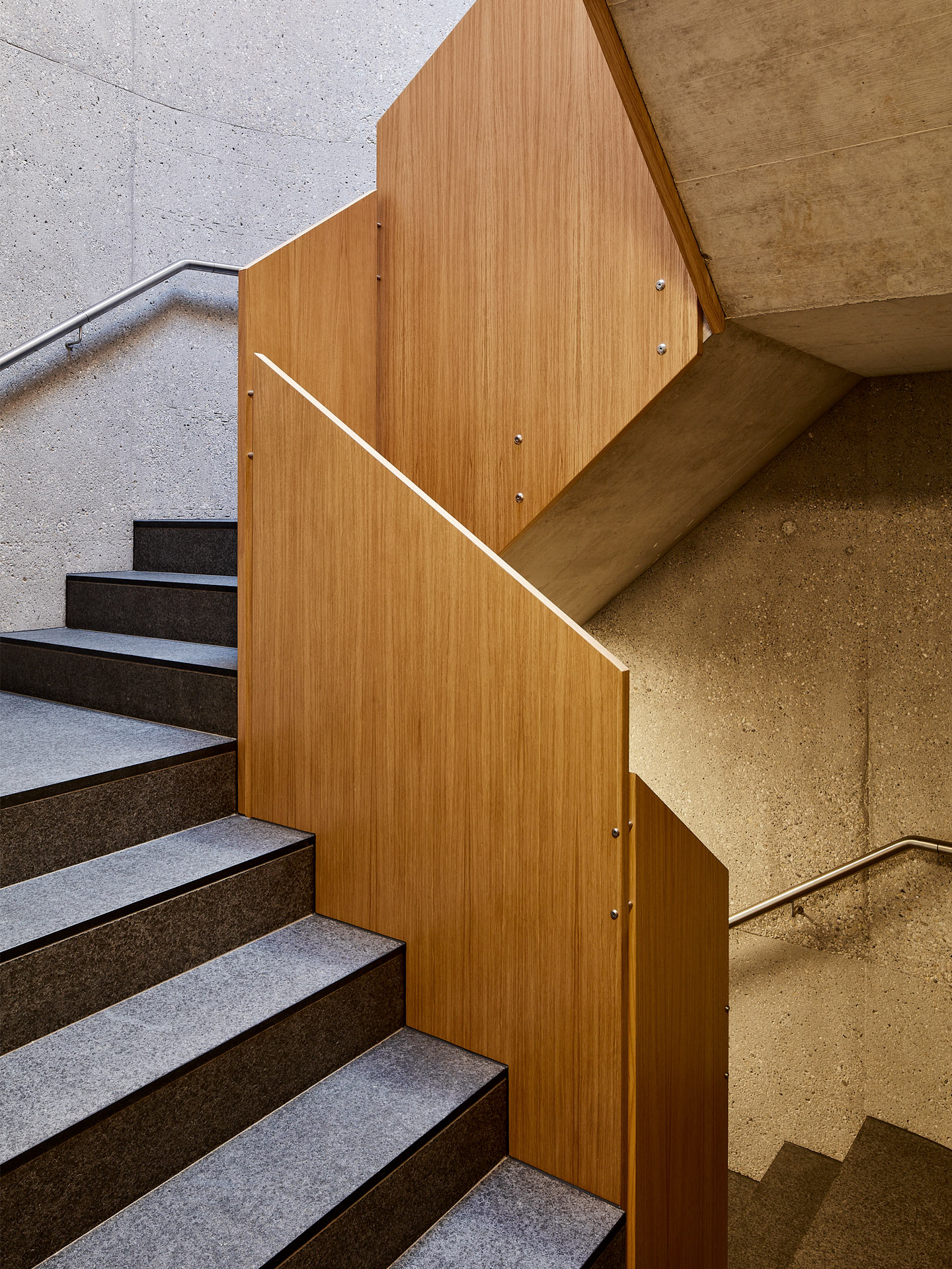 Materialidad : El proyecto busca manifestar la materialidad de su construcción. El edificio está aislado desde el exterior y revocado cuando se trata de superficies habitables (con calefacción), dejando el hormigón aparente en la medida de lo posible, lo que ayuda a definir su carácter y aspecto. Para enriquecer esta paleta mineral, se han integrado elementos metálicos, para expresar el vaciado de los volúmenes masivos, para tratar los espacios de acceso a los edificios, así como para distinguir los áticos del techo. En lo que respecta a la definición de espacios comunes interiores, la búsqueda formal sigue la misma lógica : revelar el concreto y utilizar madera (roble) para elementos de carpintería, puertas y barandas.