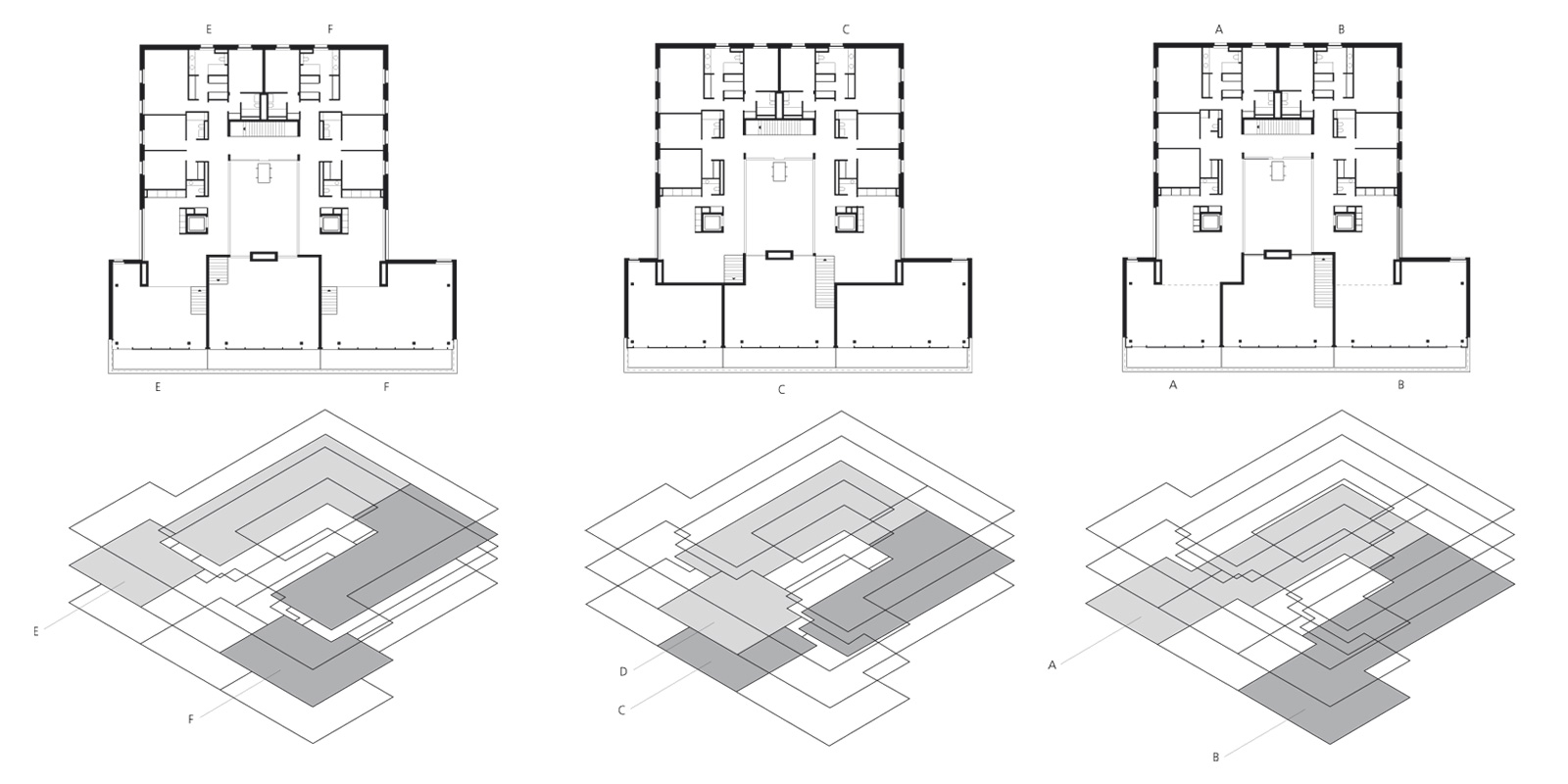 For these new constructions—two glass and brick volumes inserted into the sloping terrain and supported, at street level, by a series of concrete pilotis—the main architectural challenge was to break slightly from a traditional apartment typology of single-level dwelling units in order to provide floor heights appropriate to the proportions of living spaces. To do so, each apartment is composed of two different levels. Facing the lake, are living rooms with dramatic ceiling heights, while rooms surrounding the interior courtyard – bedrooms, baths kitchens, and dining rooms – have average ceiling hieghts. A series of two different typologies perceptible mainly through the project’s section thus overlap, both vertically and horizontally. In order to rationalize construction and articulate the “L” shape plan of each flat into a compact volume, all flats were distributed around a generous inner courtyard, the sides of which are composed of glass bricks to allow maximum income of light into the circulations and creating interesting shadows as the inhabitants move around their respective homes. The facade facing the lake, all in glass, is protected by a series of horizontal shades located at the edge of the balconies, blurring the distinction between inside and outside and conveying a sense of lightness to the whole.